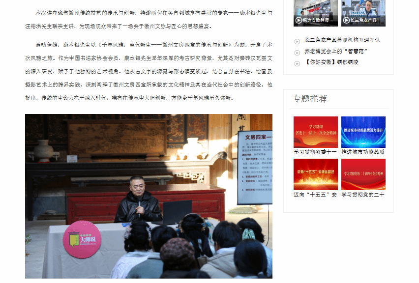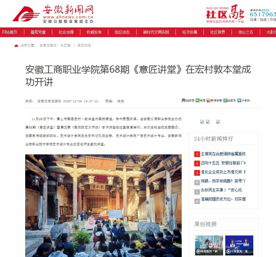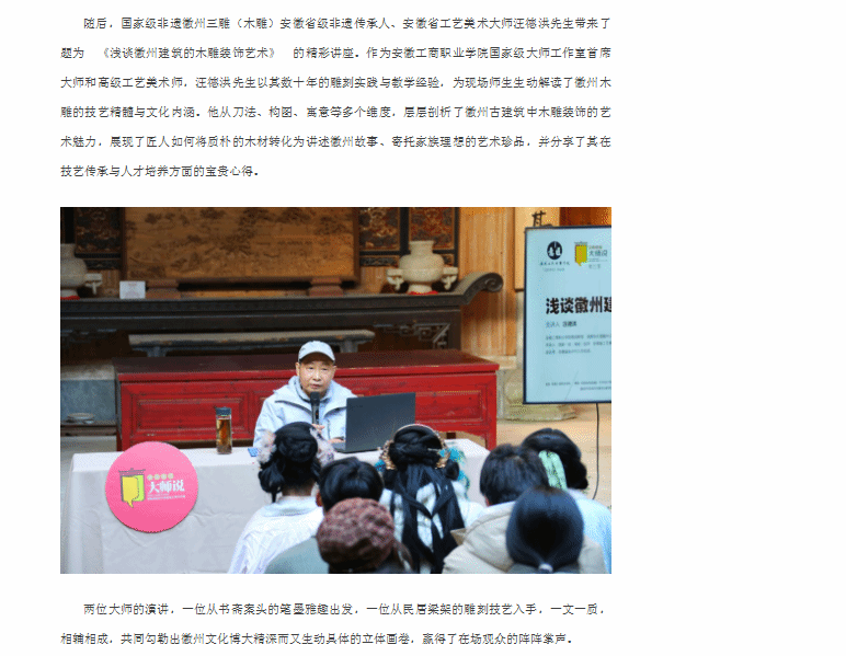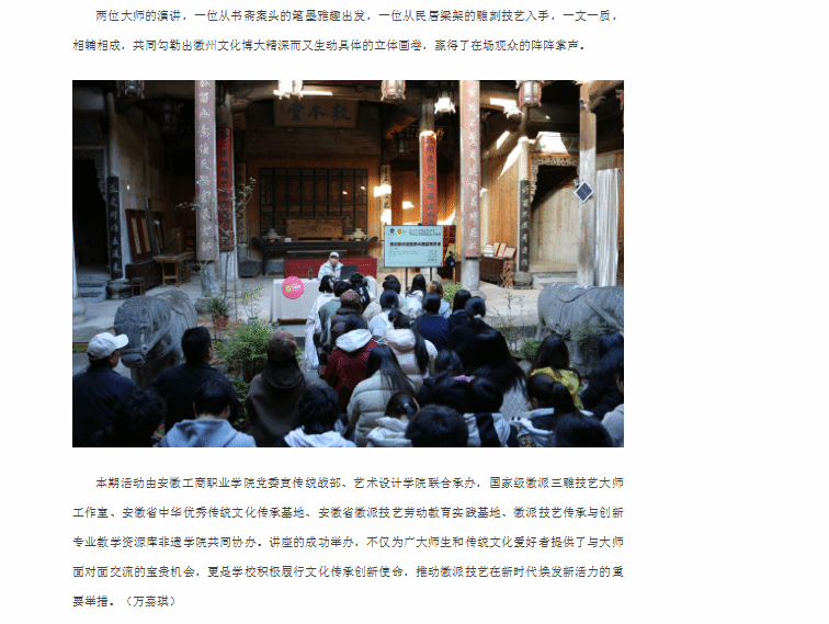 原文链接:【安徽新闻网】报道:安徽工商职业学院第六十八期意匠讲堂在宏村敦本堂成功开讲