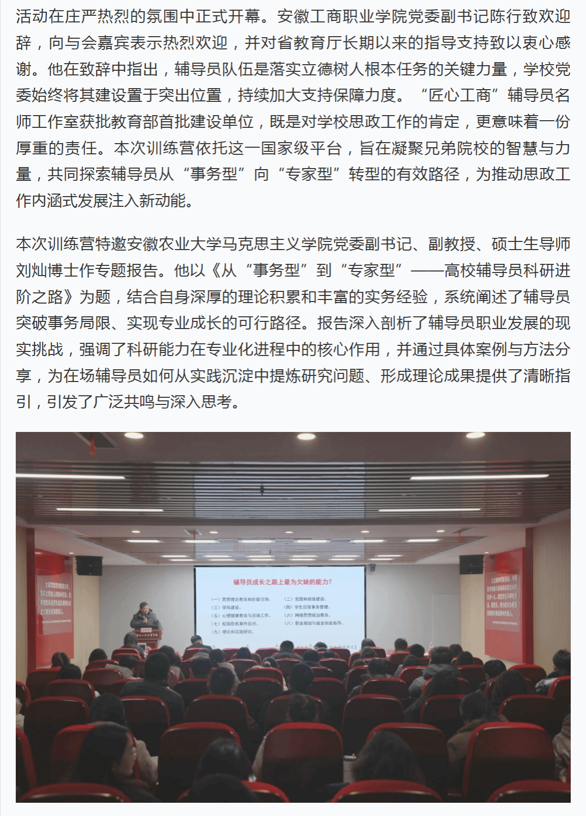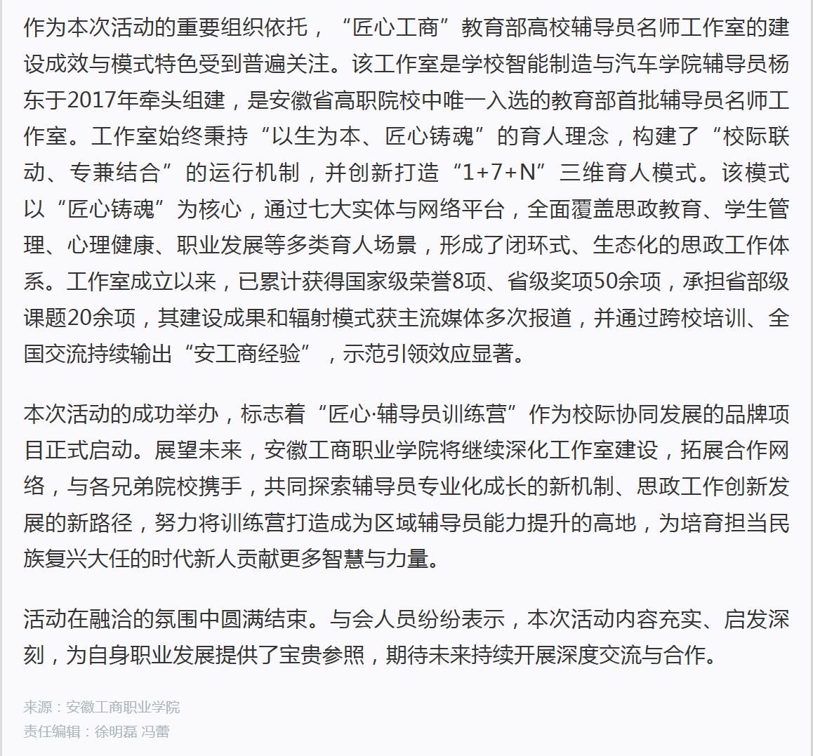 原文链接:【学习强国】报道:从“事务型”到“专家型”:安徽工商职业学院教育部辅导员名师工作室搭建跨校赋能新平台