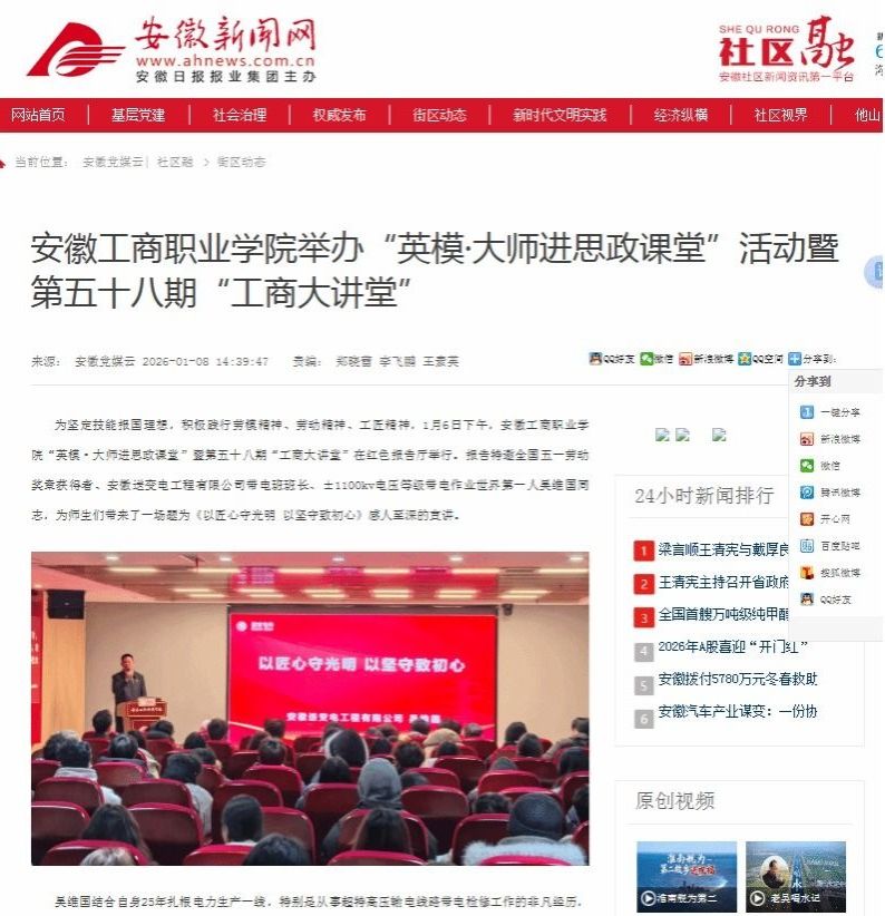 原文链接:【安徽新闻网】安徽工商职业学院举办“英模·大师进思政课堂”活动暨第五十八期“工商大讲堂”