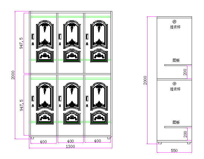 1 | 衣柜 | 衣柜规格:W1300*D550*H2000mm (1)所用的材料全部采用1.0mm优质冷轧钢板制作整体结构牢固紧密、焊接细腻无毛刺、线条均匀,表面平整光滑无杂质。柜体配有防水脚垫。 (2)柜门的分缝2MM,采用凹型钢制扣手,按图示要求制作。衣柜柜门经过专门的压花工艺,既增加了柜门的强度抗变形力,同时也使钢柜更加美观新颖。压花门压筋3条,宽度13.8mm、7.8m、12.4mm,深度3.8mm。上部分半圆半径159.8mm,压花215*268mm,下部分半圆半径165mm,压花443*268mm,半圆压筋凹凸图纹,增加强度、立体感强,外形美观。 (3)上下柜体分开为一组六门衣柜  此图仅供参考 | 38组 |