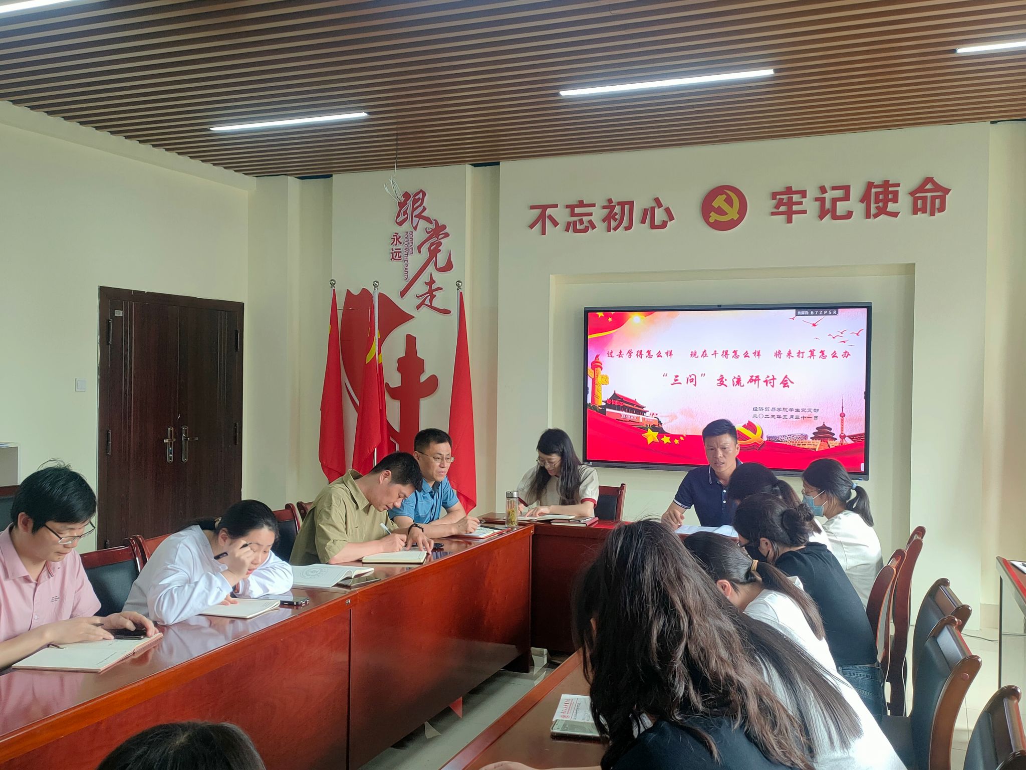 为深入开展学习贯彻习近平新时代中国特色社会主义思想主题教育,推动主题教育走深走实、入脑入心,5月31日下午,经济贸易学院学生第一、第二党支部集体开展“三问”交流研讨会,支部全体党员参会,会议由学生第二党支部书记陈夺主持。