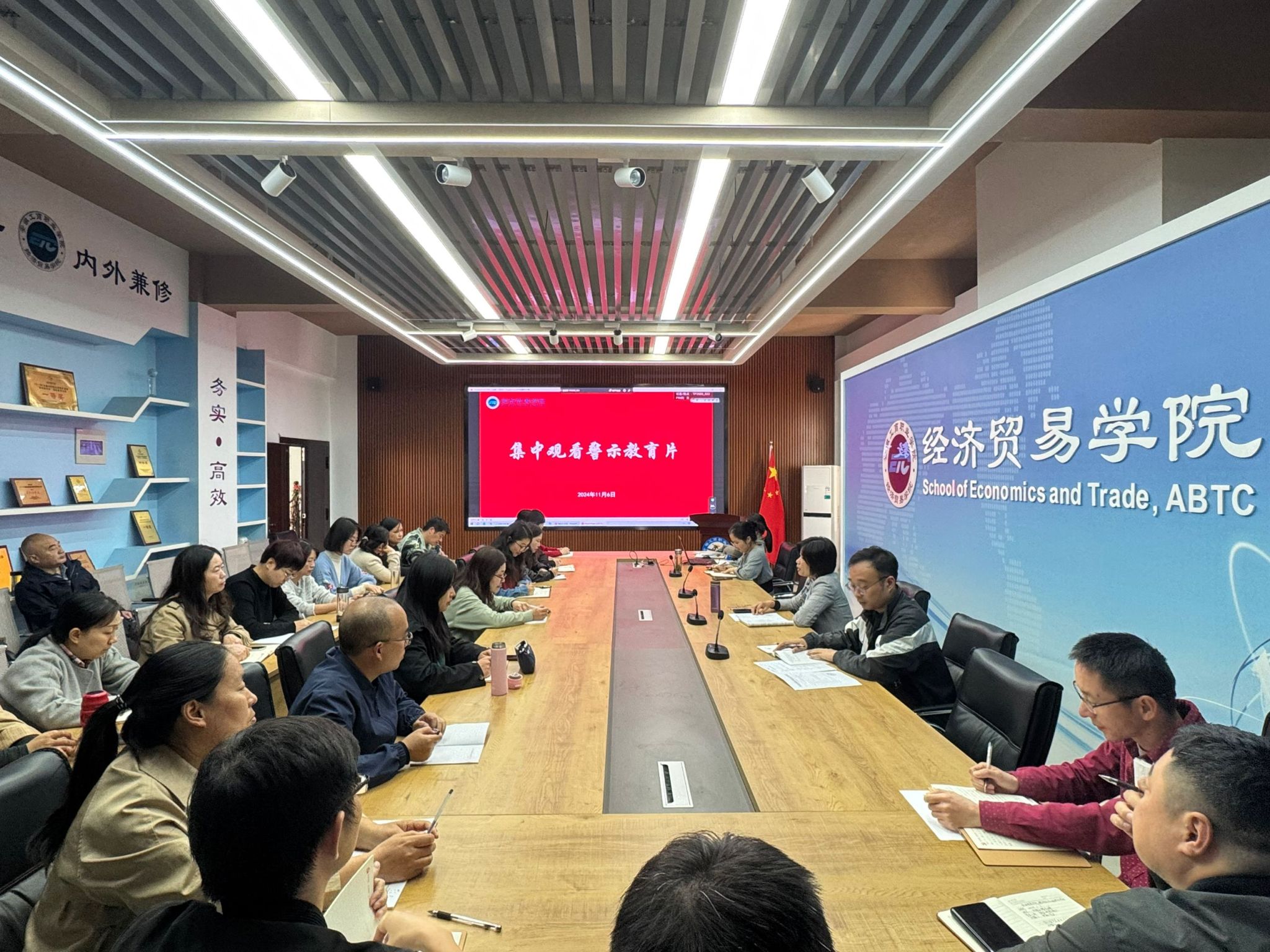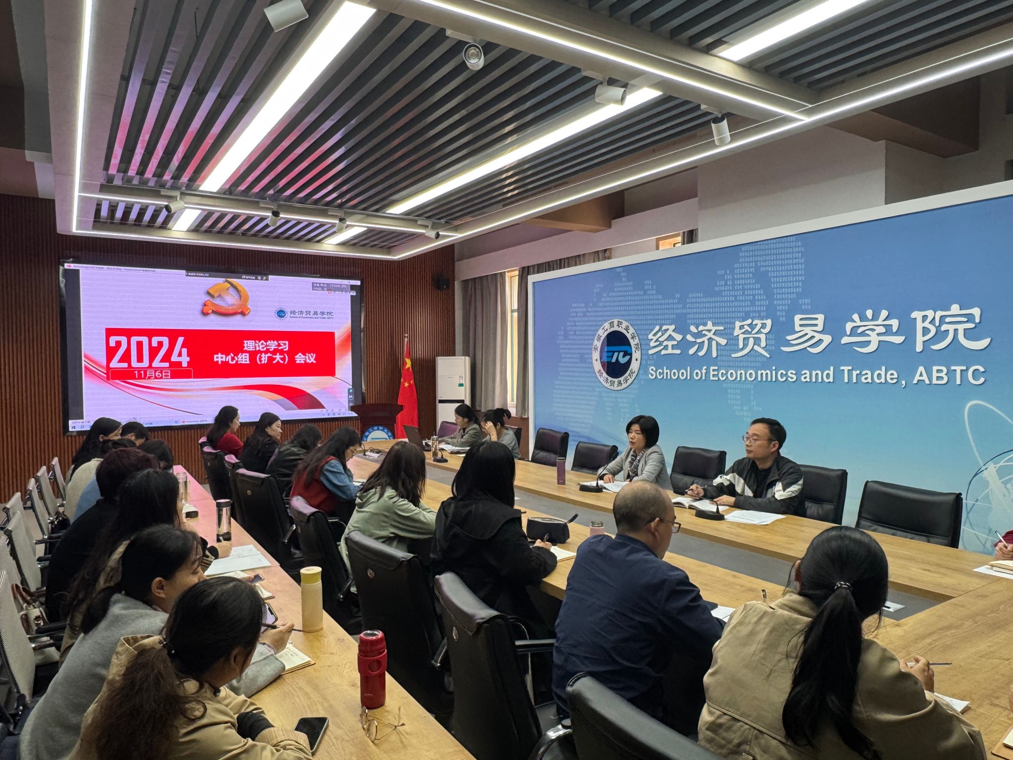 11月6日下午,经济贸易学院党总支在5楼教师能力提升中心召开理论学习中心组学习(扩大)会议,集体学习习近平总书记在安徽、福建考察时的重要讲话精神,集中观看警示教育片。会议由院长张颖主持,全体教职工参加会议。