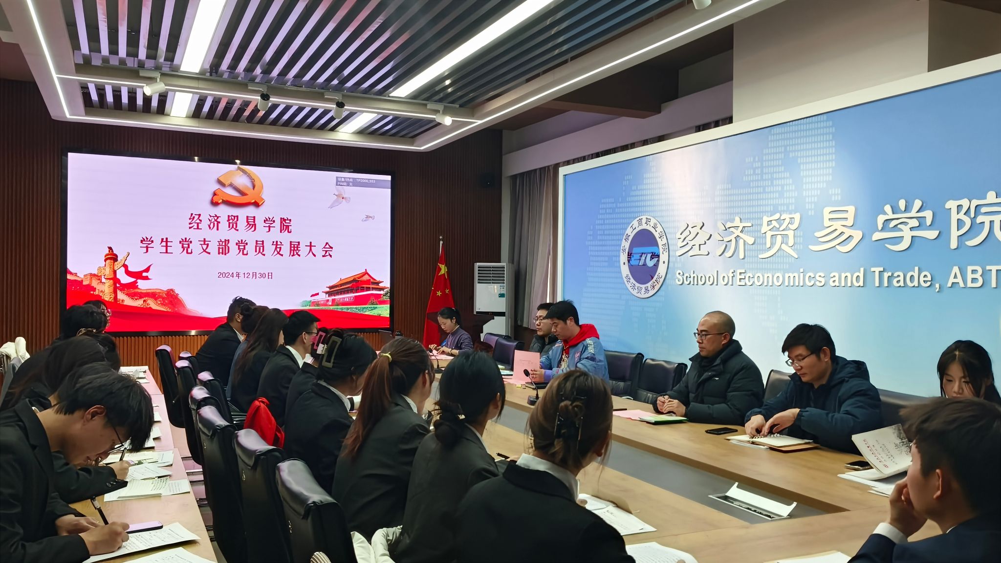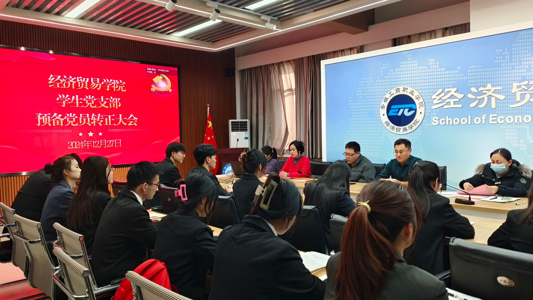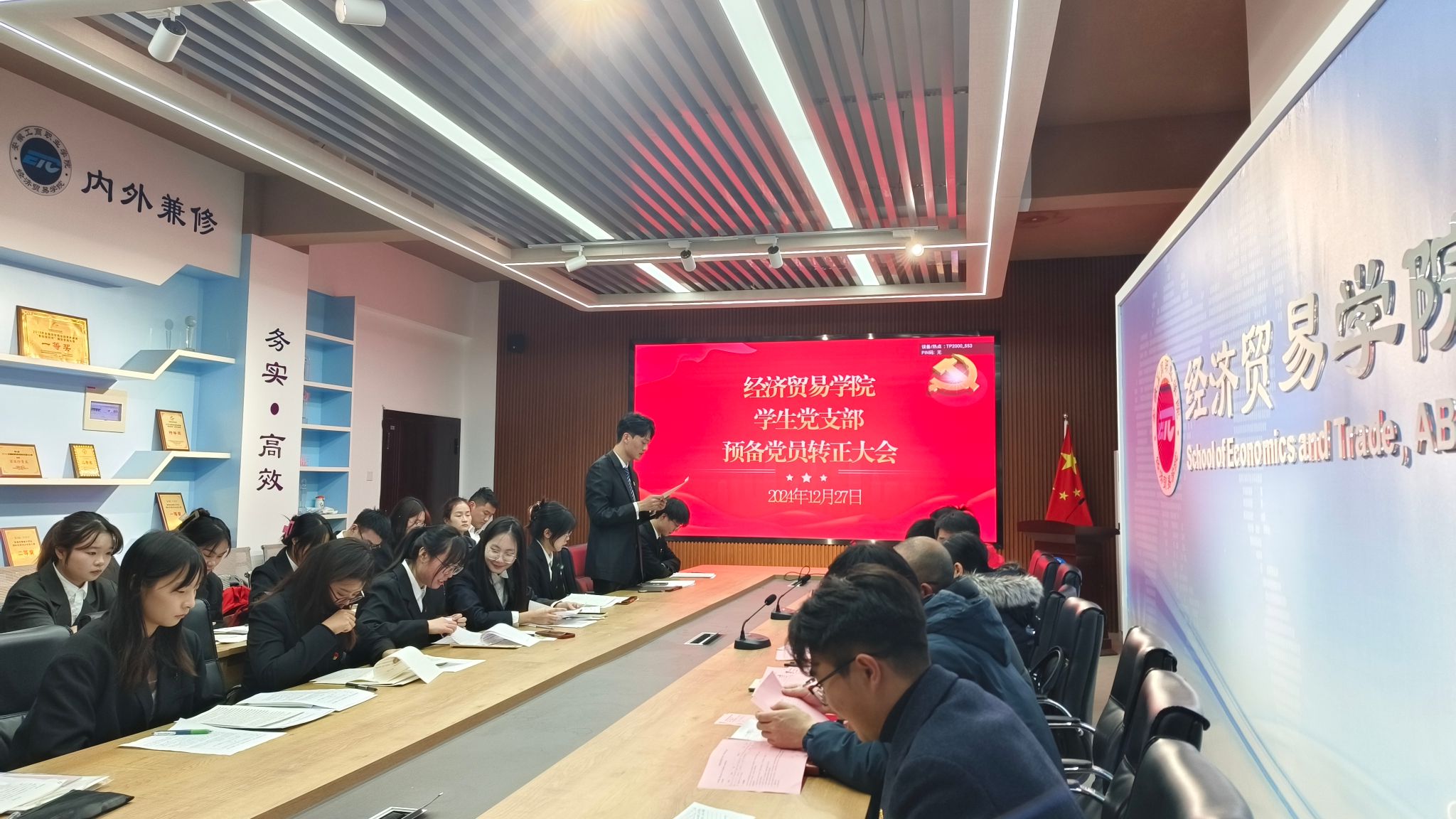 12月底,经济贸易学院学生第一党支部、第二党支部在五楼教科研中心召开党员发展大会和预备党员转正大会,党总支书记边昊到会指导,会议由各党支部书记主持,全体正式党员参加会议。