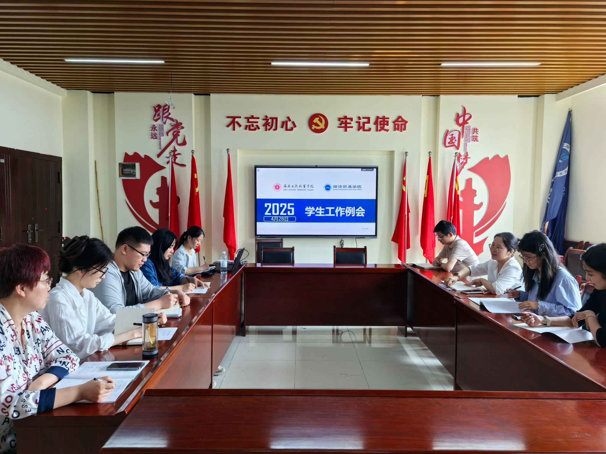 为做好学生教育管理服务工作,4月28日,经济贸易学院在学院4楼党员活动室召开学生工作例会。会议立足五一假期安全稳定关键节点,紧扣学风建设、就业指导、心理健康、反诈宣传等重点工作,全体专兼职辅导员参加会议,会议由学院党总支副书记马莉主持。
