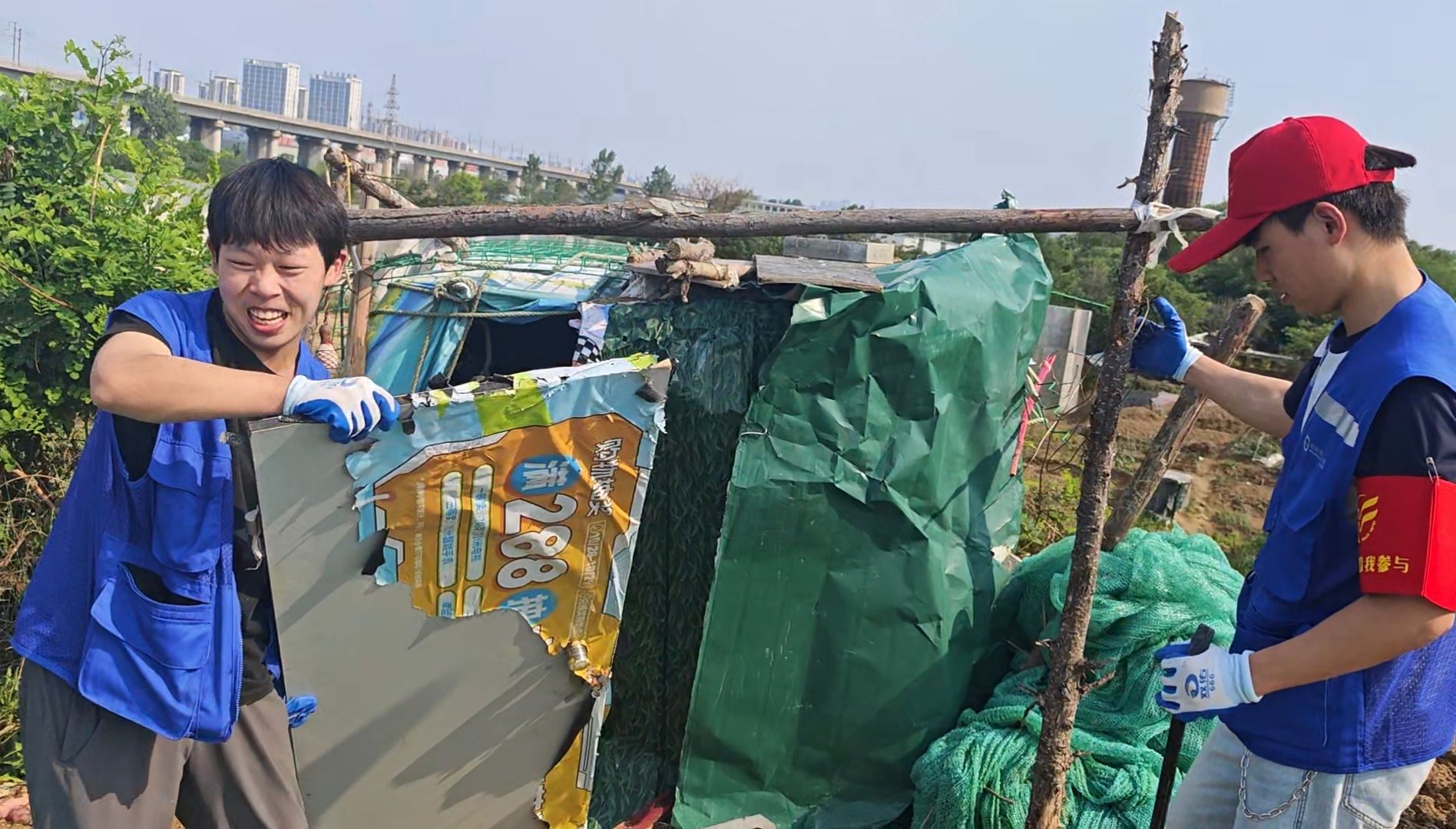 针对火车道周边空地区域存在的卫生死角垃圾堆积、违规占用公共空间私拉乱建(如简易窝棚、堆放杂物的临时构筑物)等问题,同学们手持工具,深入铁道护坡、沿线空地及周边沟渠等卫生死角,奋力清理散落的生活垃圾、废弃工业包装物、塑料薄膜、枯枝杂草等各类废弃物。汗水在衣背绘出深浅的地图,步履在热土刻下奉献的印记。本次行动重点之一,是清理严重影响铁路运行安全和环境整洁的违规建筑。在经开区城管执法人员的现场指导与安全保障下,志愿者们耐心沟通解释,协助搬运清理堆放物品,对多处违建进行了安全、有序的拆除,恢复了铁路沿线公共空间的整洁与安全秩序。