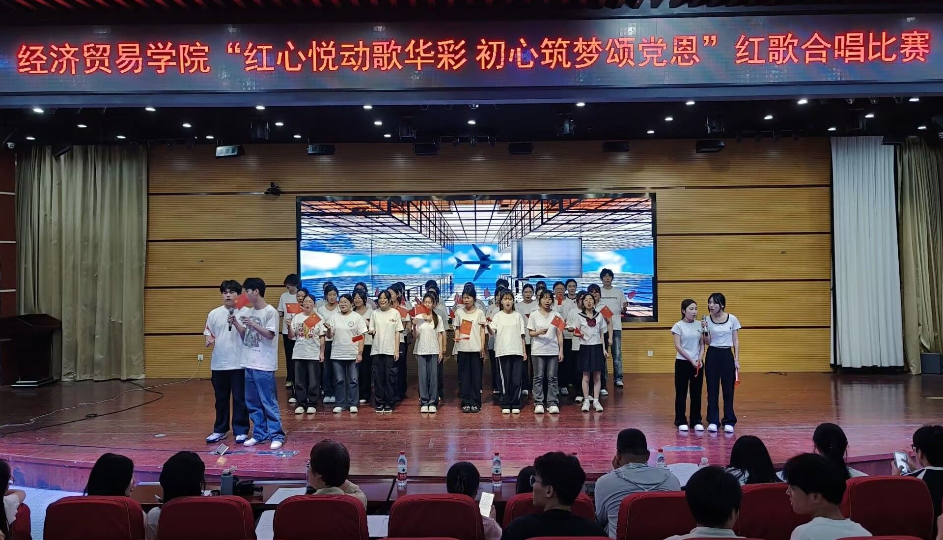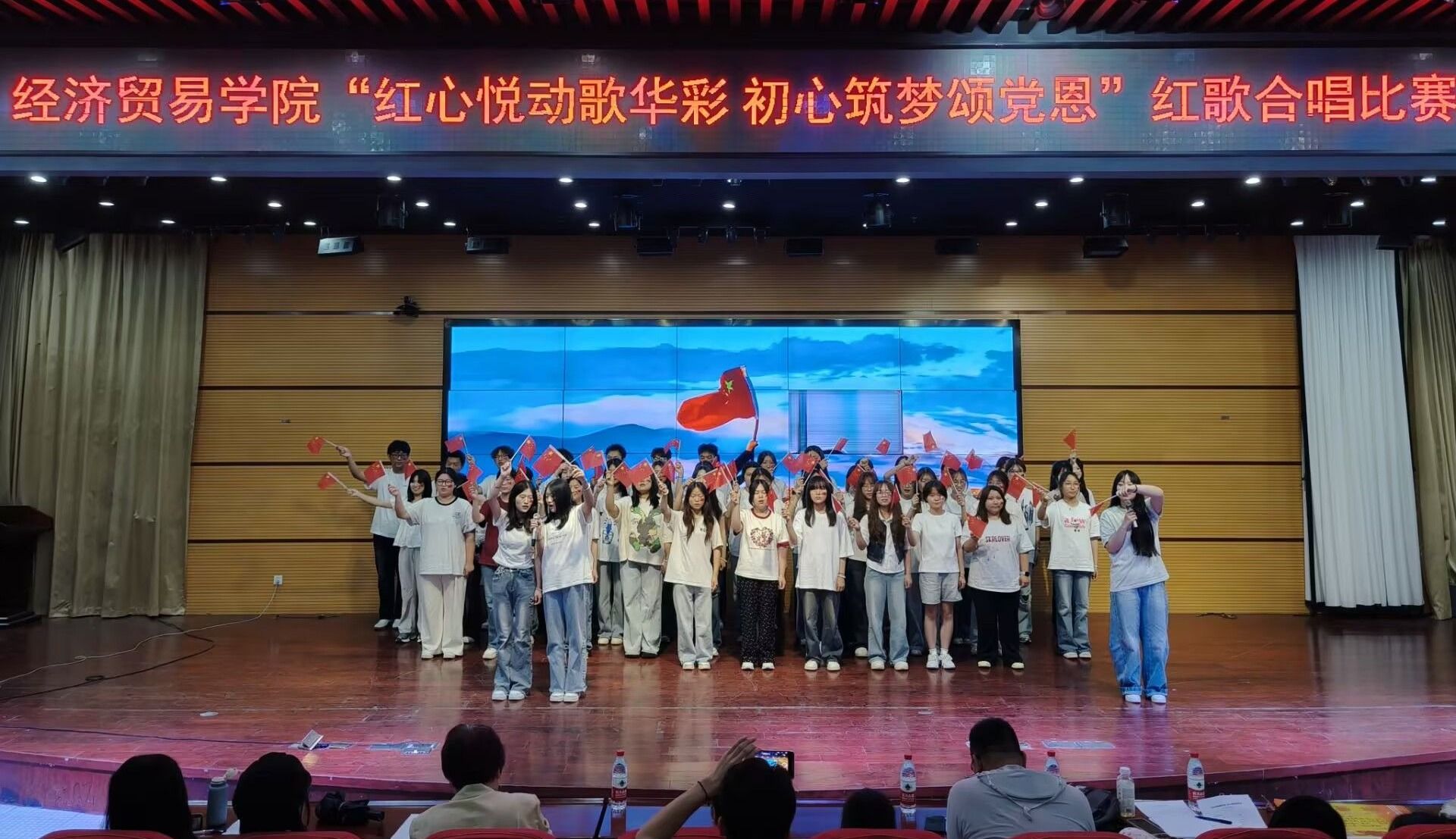 为弘扬伟大建党精神,用经典旋律重温光辉历程、唱响爱党主旋律,展现青年学子团结奋进、担当有为的时代风貌。6月5日晚,经济贸易学院“红心悦动歌华彩 初心筑梦颂党恩”主题红歌合唱比赛在学院学术报告厅隆重举行。学院各班级代表队400余名师生齐聚一堂,以嘹亮歌声唱响时代强音。