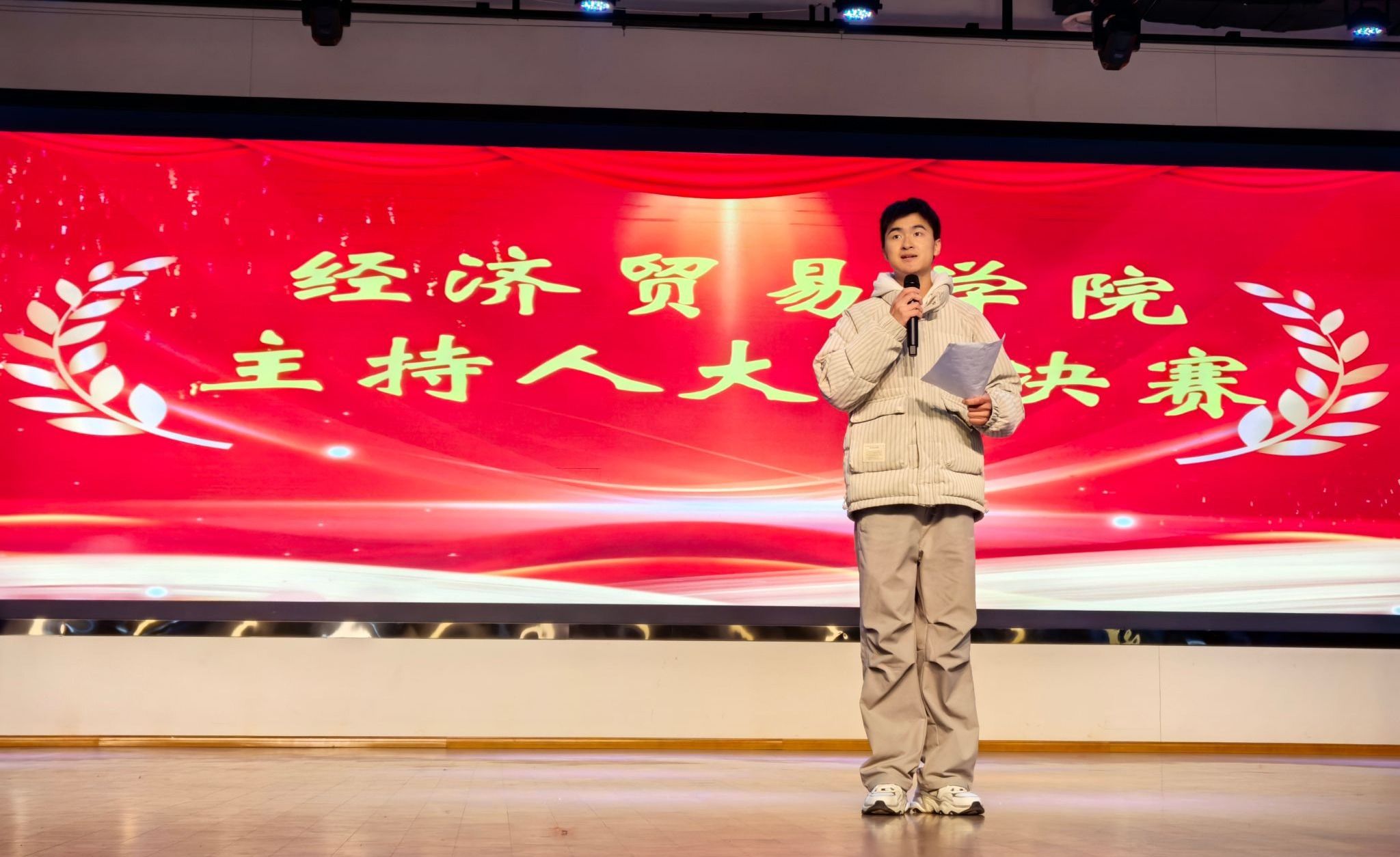 12月3日,经济贸易学院新生主持人大赛在大学生活动中心圆满落幕。本次比赛以“声动青春,语绎风华”为主题,通过“自我介绍”“才艺展示”“模拟主持”三大环节,全面展示了新生的艺术才华与专业素养,生动诠释了智育与美育的有机结合。