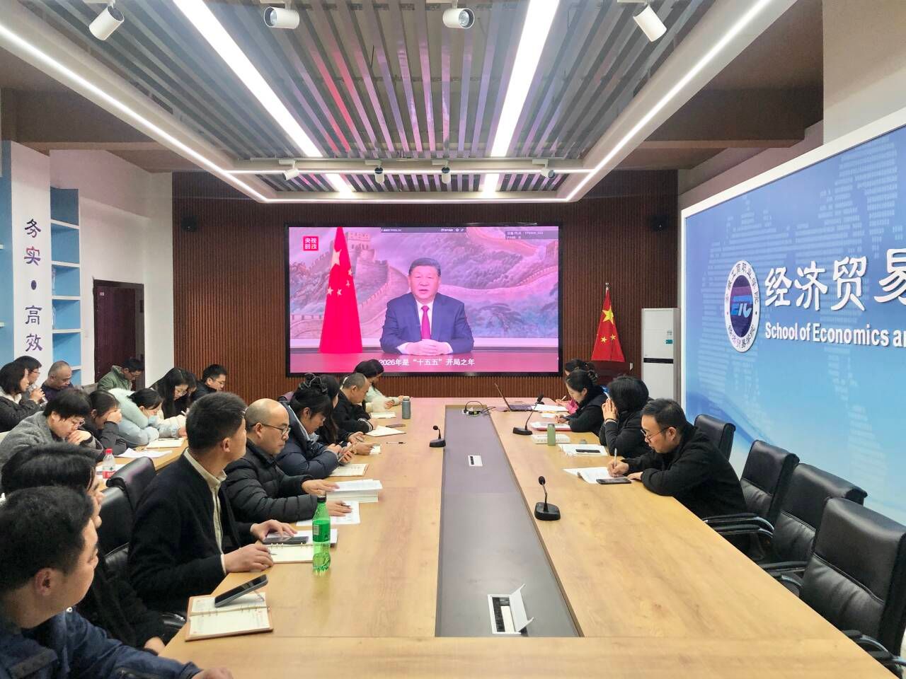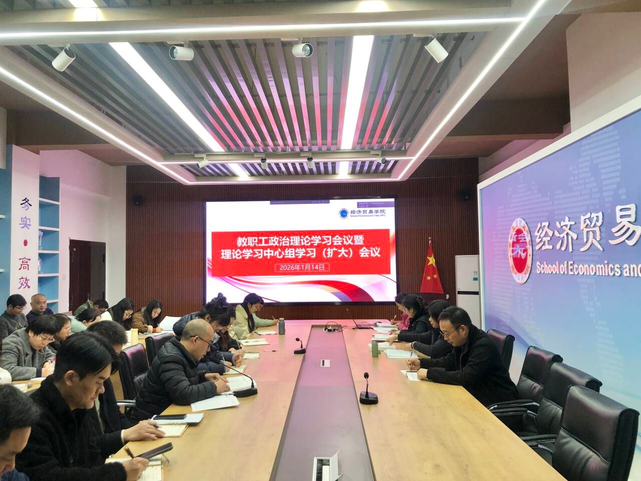 1月14日,经济贸易学院党总支在5楼教师能力提升中心召开教职工政治理论学习暨理论学习中心组学习(扩大)会议,传达学习习近平总书记2026年新年贺词,学习省委十一届十一次全会精神,持续深入学习《习近平谈治国理政》第五卷内容。会议由党总支副书记马莉主持,全体教职工参加会议。