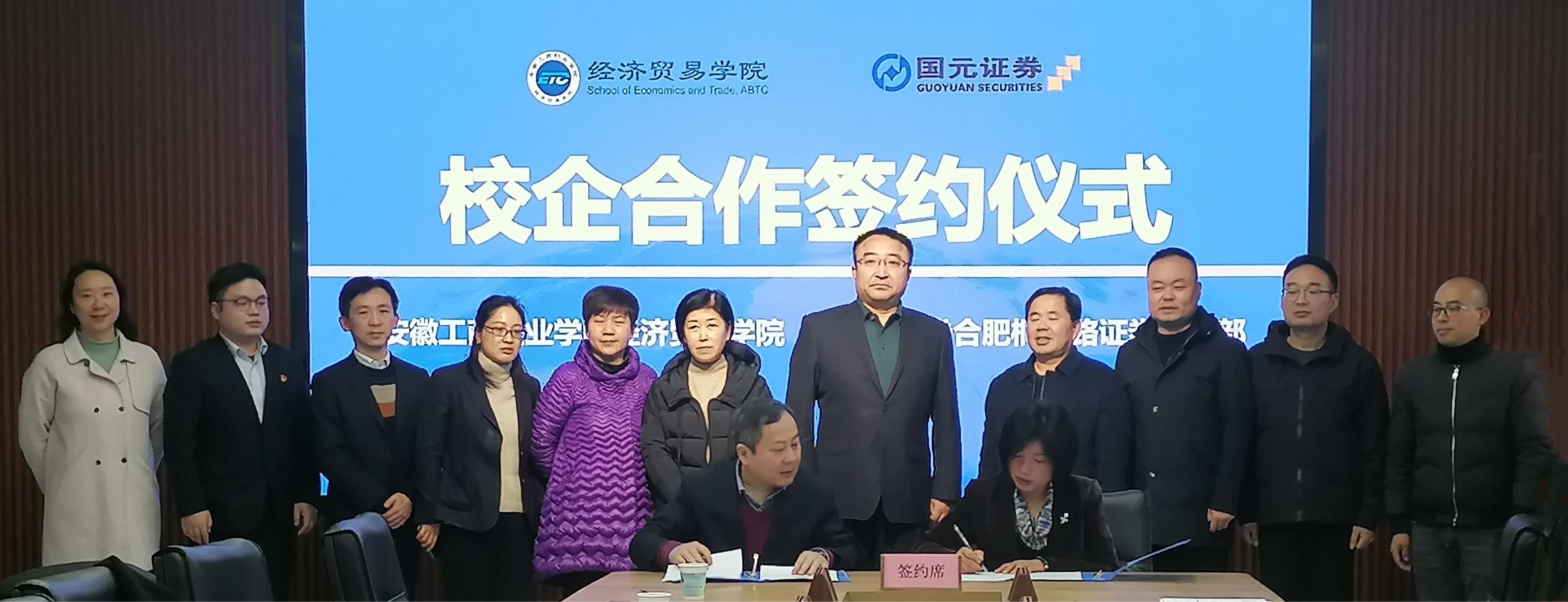 2023年3月22日下午14时,我校经济贸易学院与国元证券校企合作签约仪式在经济贸易学院教师能力提升中心举办。国元证券总裁助理、合肥分公司总经理张俊、国元证券合肥桐城路证券营业部总经理窦遐晖、人力资源部经理王亚梅、赵鹏、宜峥峰、叶季鑫、方小雨、经济贸易学院院长张颖、党总支常务副书记沈飞、办公室主任王韦、教务科科长张键、金融服务与管理专业带头人周瀚醇等参加了本次仪式。