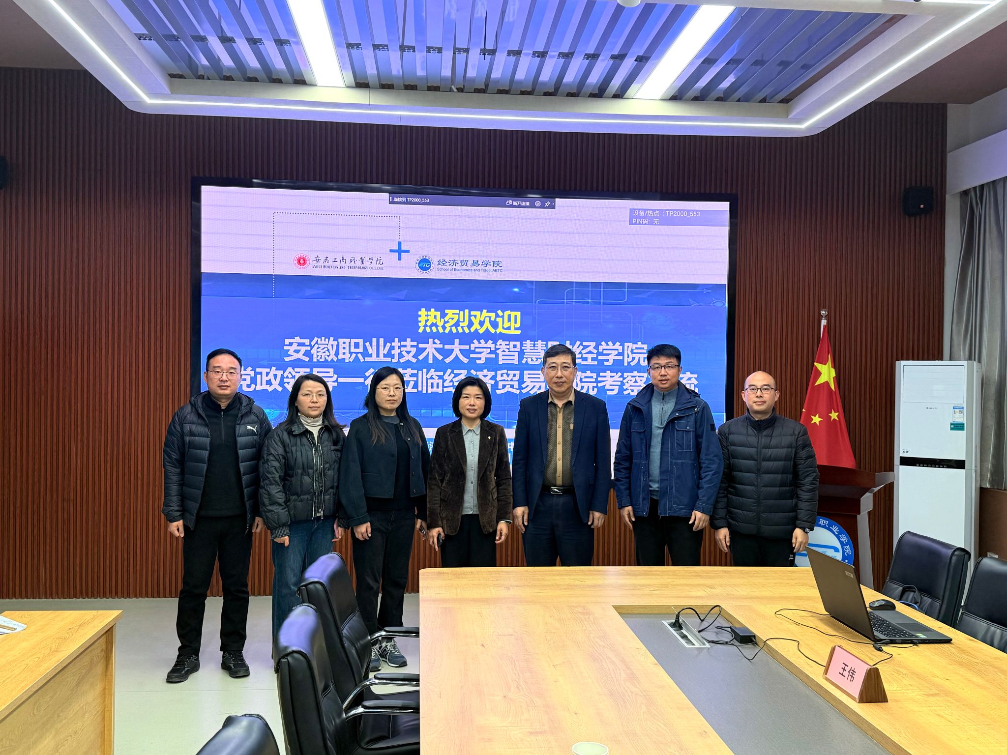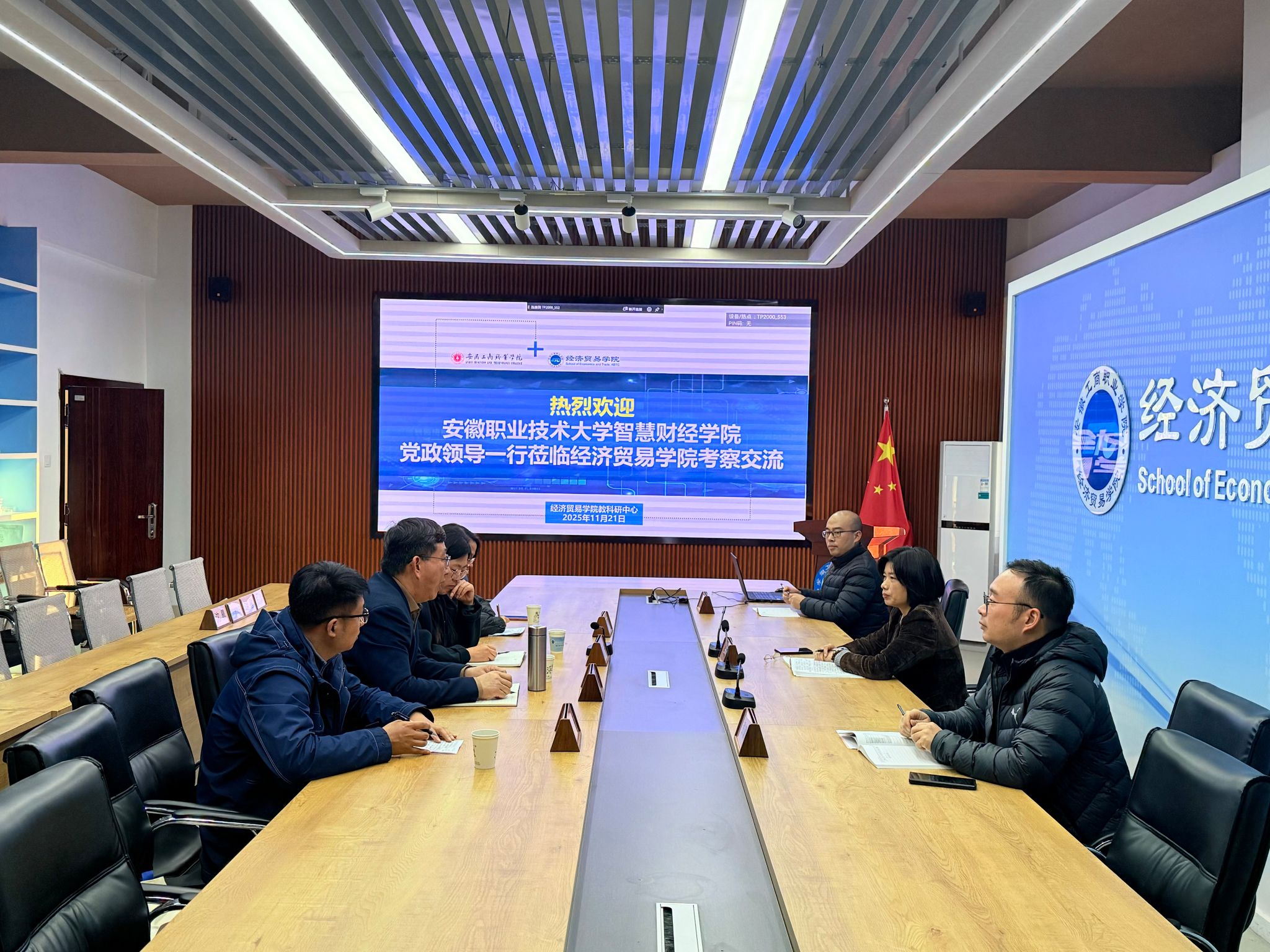 11月21日下午,安徽职业技术大学智慧财经学院党政领导一行4人来我校经济贸易学院考察交流。经济贸易学院院长张颖、副院长张键、教务科长王伟参加了交流活动。