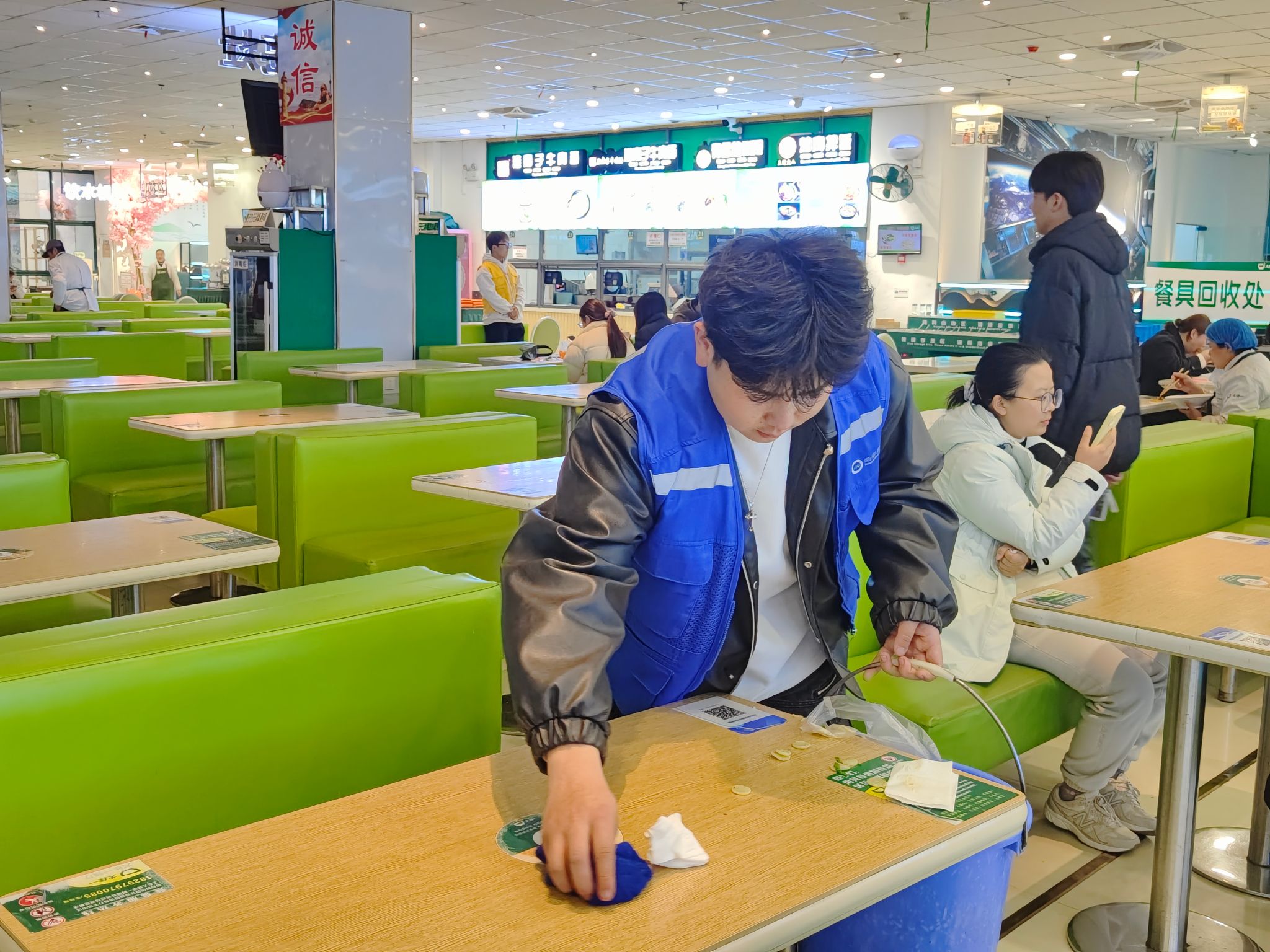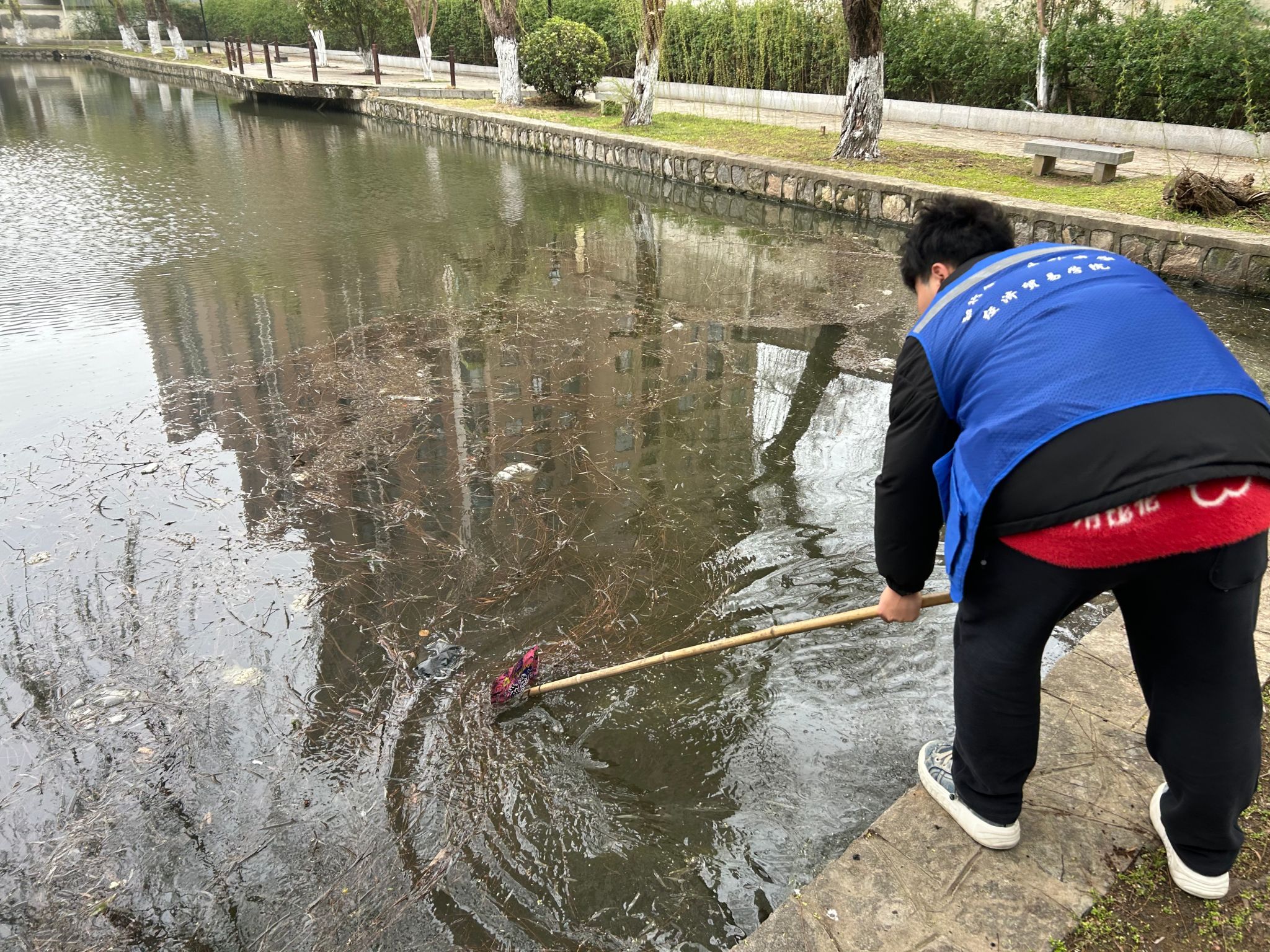 活动中,同学们热情高涨,干劲十足,三人一组、五人一群,分工明确,相互协作,不放过任何一个角落。教室内,同学们细致擦拭玻璃、清理桌面广告;食堂中,倡导“光盘行动”,擦拭餐桌、整理餐具,引导同学们文明用餐、节约粮食;池塘边,细致拾取塑料、烟头等垃圾,清除草丛中细小废弃物。流动的“经贸蓝”成为了校园里亮眼的风景线,同学们用行动诠释新时代青年的责任与担当,充分展现经贸学子学子们不怕脏、不怕累、团结协作、积极向上的精神风貌。