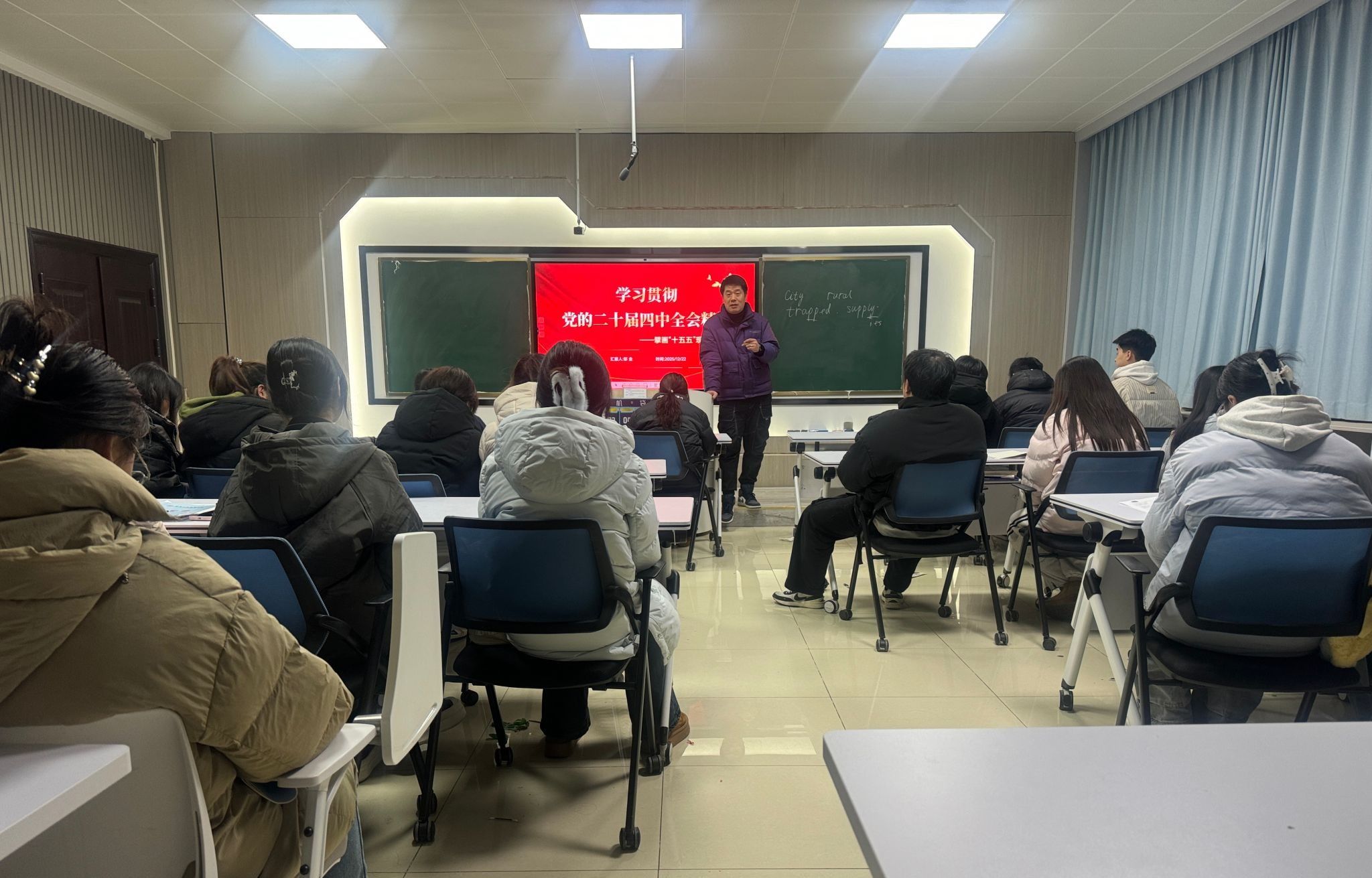 课上,邬金首先带领与会同学深入研读了习近平总书记在党的二十届四中全会上的重要讲话精神及相关重要论述,并围绕“十五五”时期经济社会发展的总体思路、主要目标及“六个坚持”重要原则组织专题研讨。
