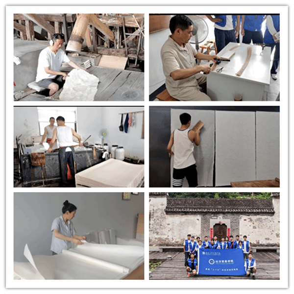 体验非遗魅力 传承传统文化  宣纸,是享誉世界的安徽文化名片。泾县深挖优秀传统文化资源,与现代设计巧妙结合,文化创意产品不断涌现,中国传统文化走出“深闺”,让传承千百年的文化遗产“活起来”、“火起来”,走出国门,走向世界。在中国宣纸文化园,实践团成员们畅游在“宣纸印象”“若水一脉”“雪月风华”“白云深处”“星光灿烂”篇章中,聆听宣纸故事,感悟宣纸的传奇一生。携手体验古法捞纸技艺,一槽纸浆,一张竹帘,一捞一提间,完成了一张演绎着万种风情的宣纸,感受着人类非物质文化遗产的独特魅力。作为中国文房四宝之首、中国四大名笔之一的宣笔,同样吸引了大家的目光。在讲解员的带领下,实践团成员们了解到成笔的每一道工序。缕齐毛尾,牙刷梳理 ,乳胶固定……每个步骤,成员们仔细学、埋头做,一道道工序,全应古制,仿佛看到了白居易描述的“千万毛中拣一毫”的场景。