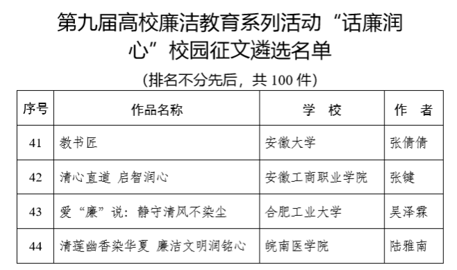 近日,教育部公布了第九届高校廉洁教育系列活动结果,安徽省共有15所本科、5所高职院校的作品入选各项百优遴选名单。我校经济贸易学院副院长张键的作品成功入选“话廉润心”校园征文百优遴选名单。