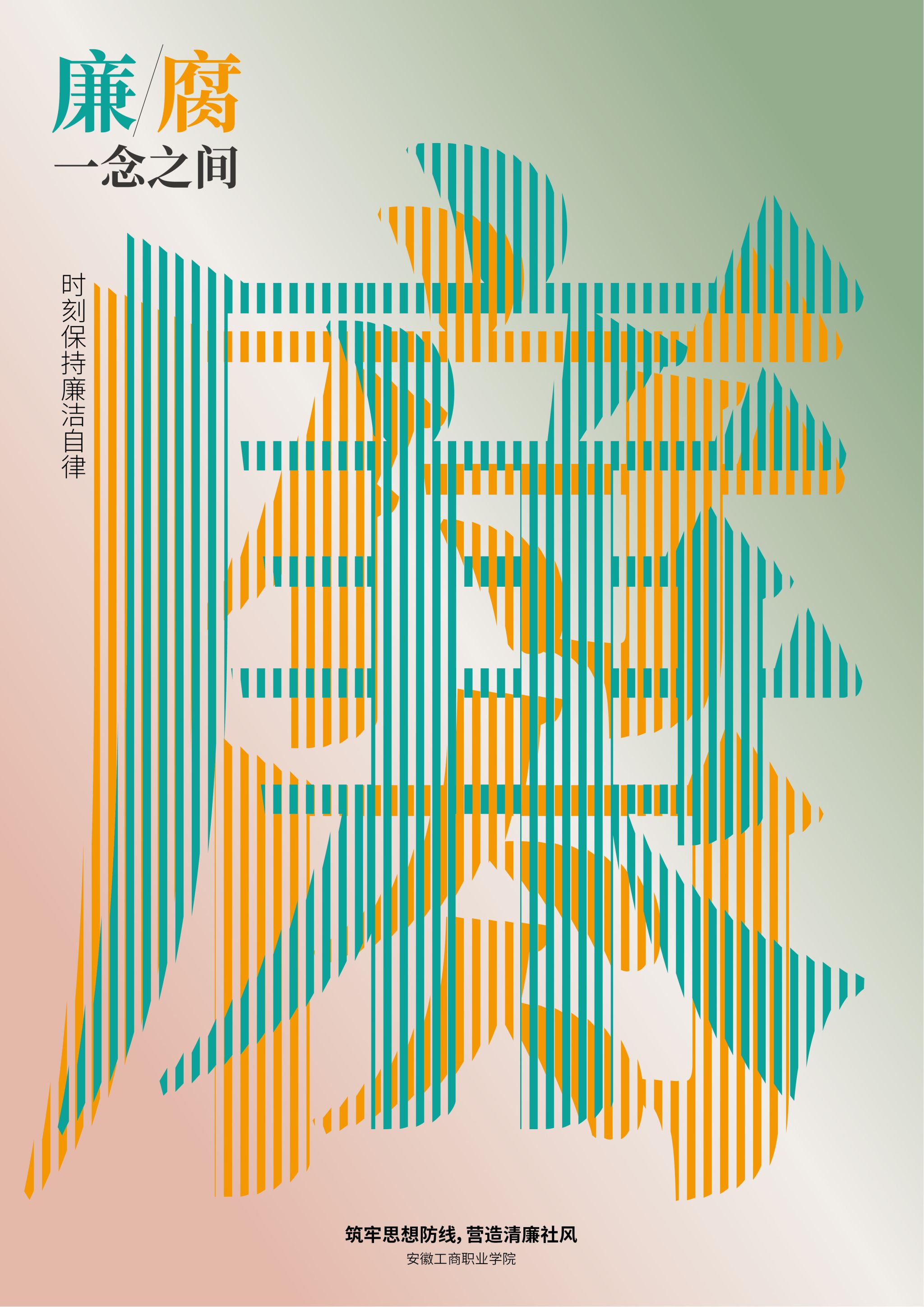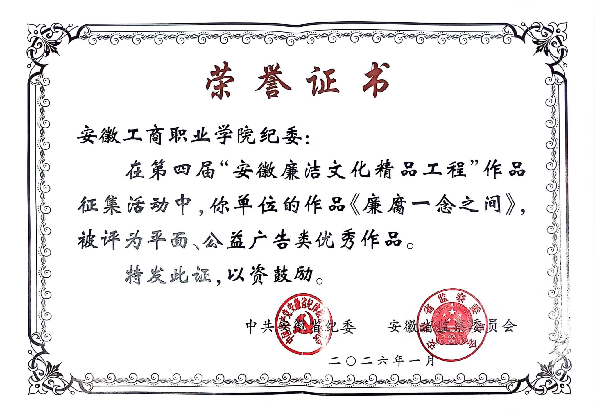 2026年1月,第四届“安徽廉洁文化精品工程”作品征集活动评选结果正式公布。在全省1300余件(部/本)参评作品中,由我校纪委精心出品,赵中华、张乐两位老师联合创作的《廉腐一念之间》脱颖而出,成功获评平面、公益广告类优秀作品。