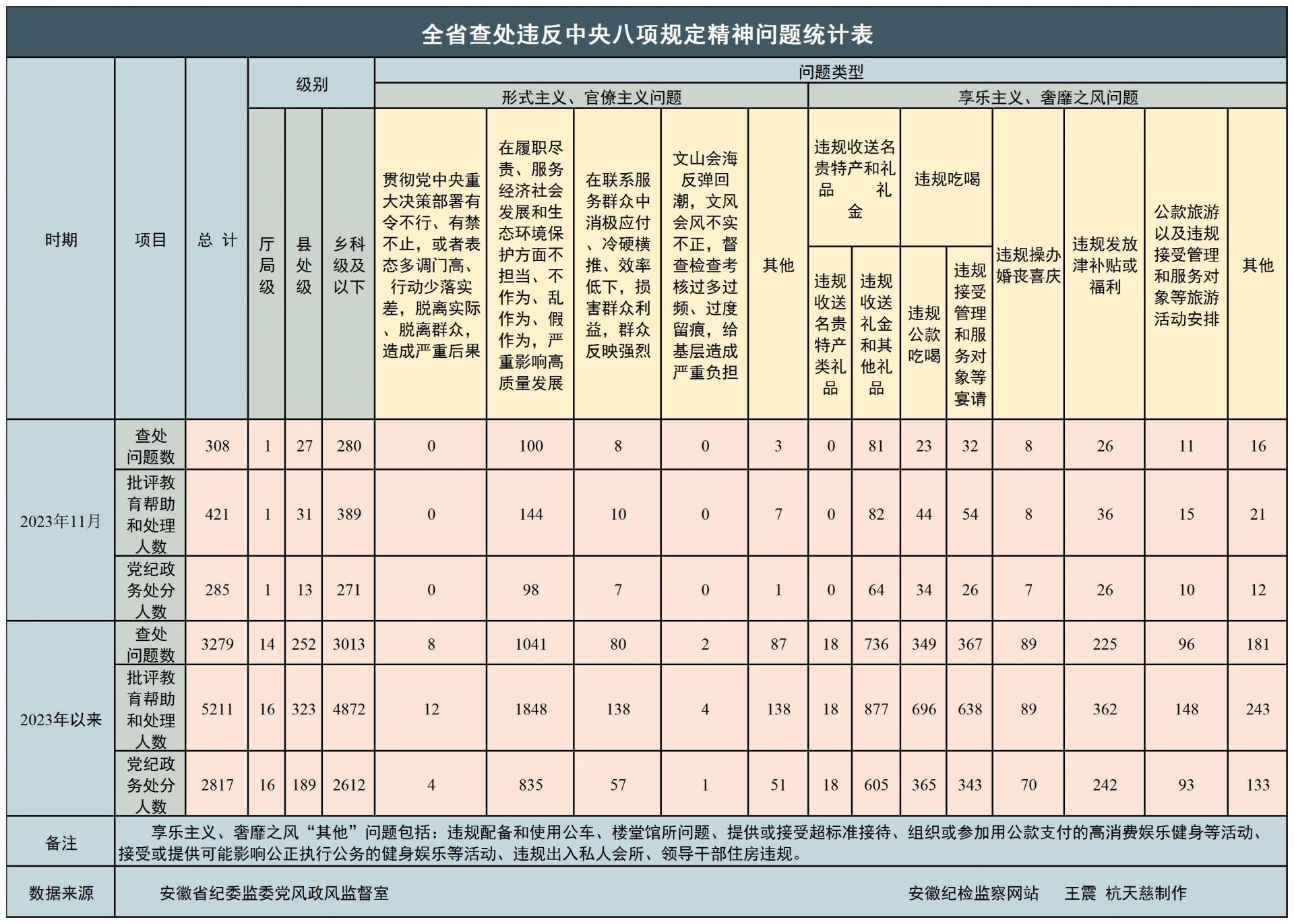 2023年11月全省查处违反中央八项规定精神问题统计指标表