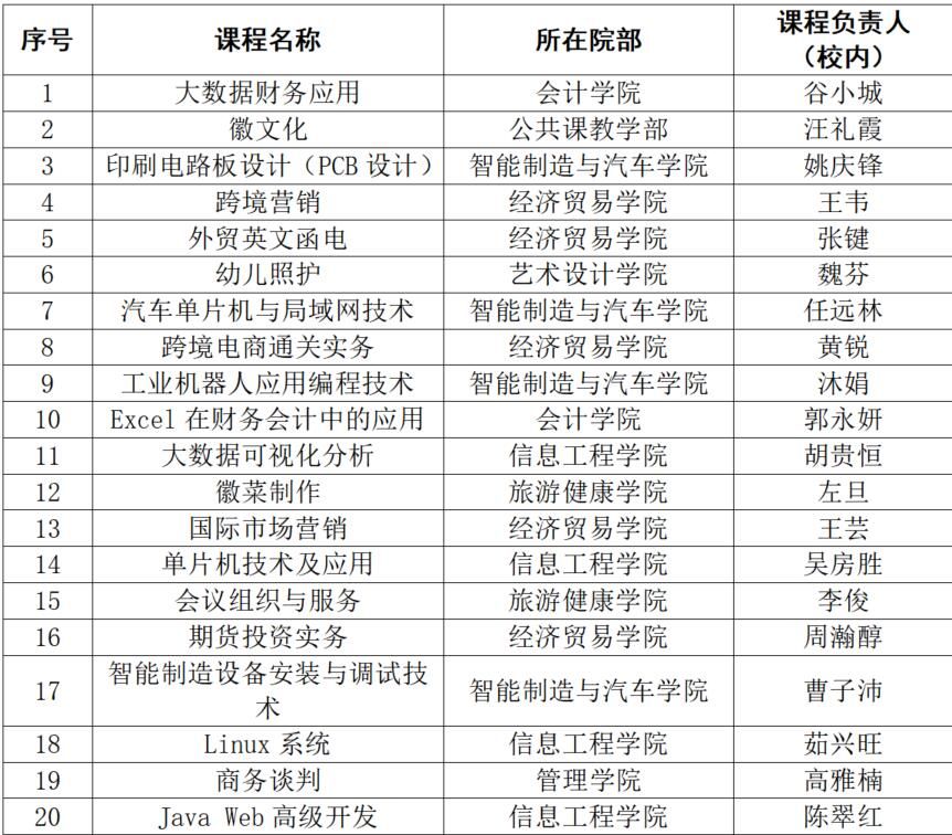 根据安徽工商职业学院《关于开展“工商金课”项目申报工作的通知》(皖字〔2024〕108号)文件精神,经教师申报,二级院部审核,校外专家评审,拟立项《大数据财务应用》等20门课程为“工商金课”建设项目,《思想道德与法治》等11门课程为“工商金课”培育项目,现对拟立项课程名单进行公示。
