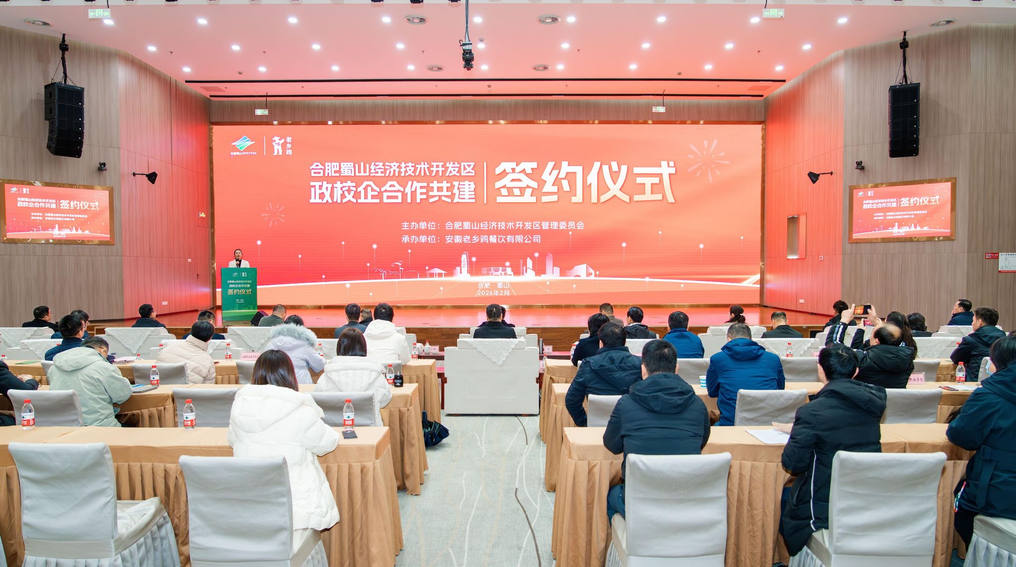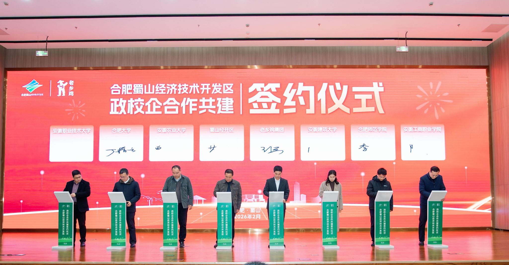 仪式现场,合肥蜀山经济技术开发区作为政府方签约,老乡鸡集团作为企业方签约,安徽农业大学、安徽建筑大学、合肥大学、合肥师范学院、安徽职业技术大学、安徽工商职业学院、安徽水利水电职业技术学院、安徽新闻出版职业技术学院、安徽邮电职业技术学院、徽商职业学院、安徽绿海商务职业学院、合肥通用职业技术学院共十二所高校作为校方代表依次签约。活动中,企业代表与高校代表围绕未来合作方向进行了深入交流与探讨。