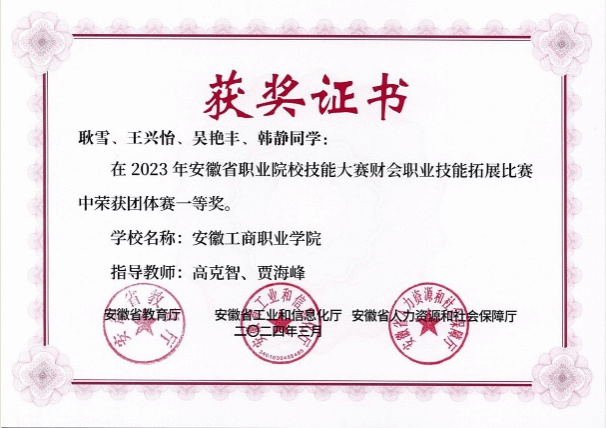 2023年安徽省财会职业技能拓展竞赛高职组获一等奖2项。