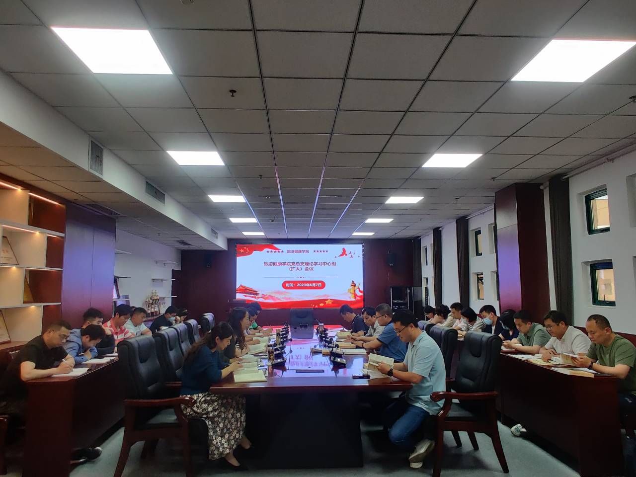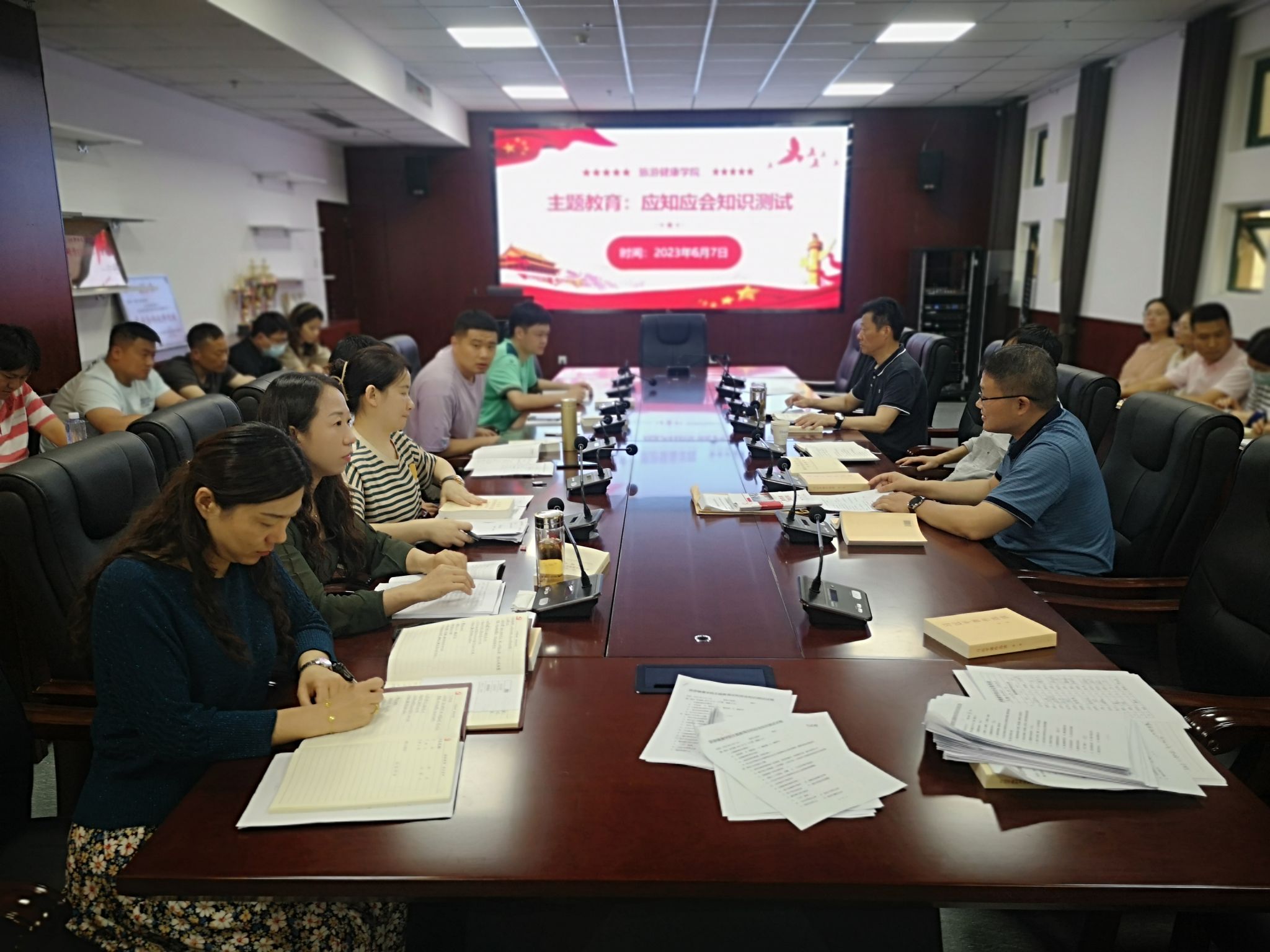 6月7日,旅游健康学院在三楼会议室如期举行教职工政治学习日活动,本次活动组织开展主题教育理论学习暨应知应会知识测试,学院全体教职工参加学习,校党委委员、纪委书记吴松飞以普通党员身份参加会议。会议由旅游健康学院党总支书记杨锐主持。