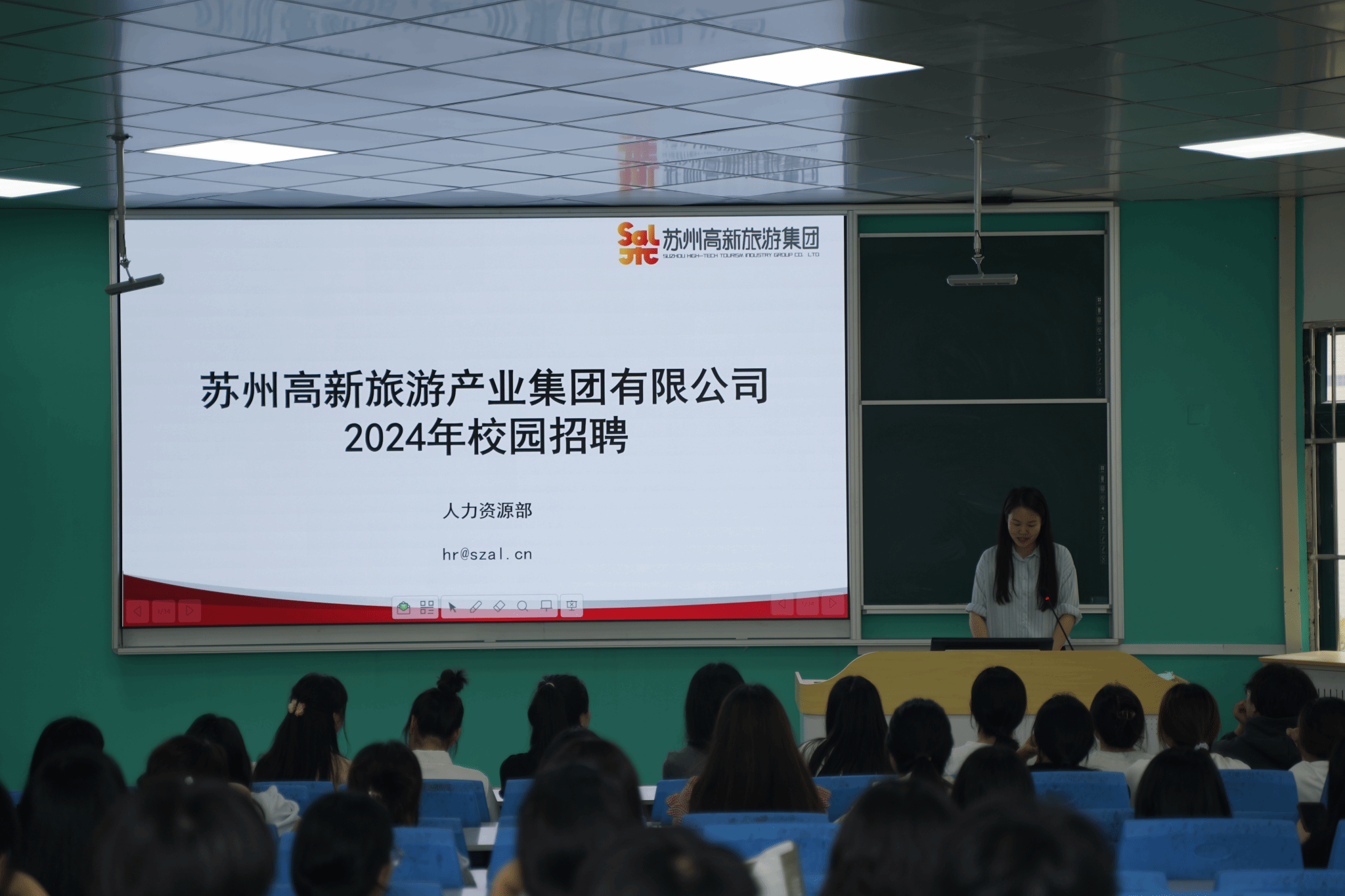 各企业招聘宣讲人利用PPT介绍、播放企业宣传视频等方式介绍各自企业的基本情况、文化建设、用人要求、晋升渠道、岗位薪资等内容。同时各企业现场对实习就业问题与学生们进行了互动问答,学生对部分招聘岗位表现出强烈的兴趣。整场宣讲会取得了良好的效果。