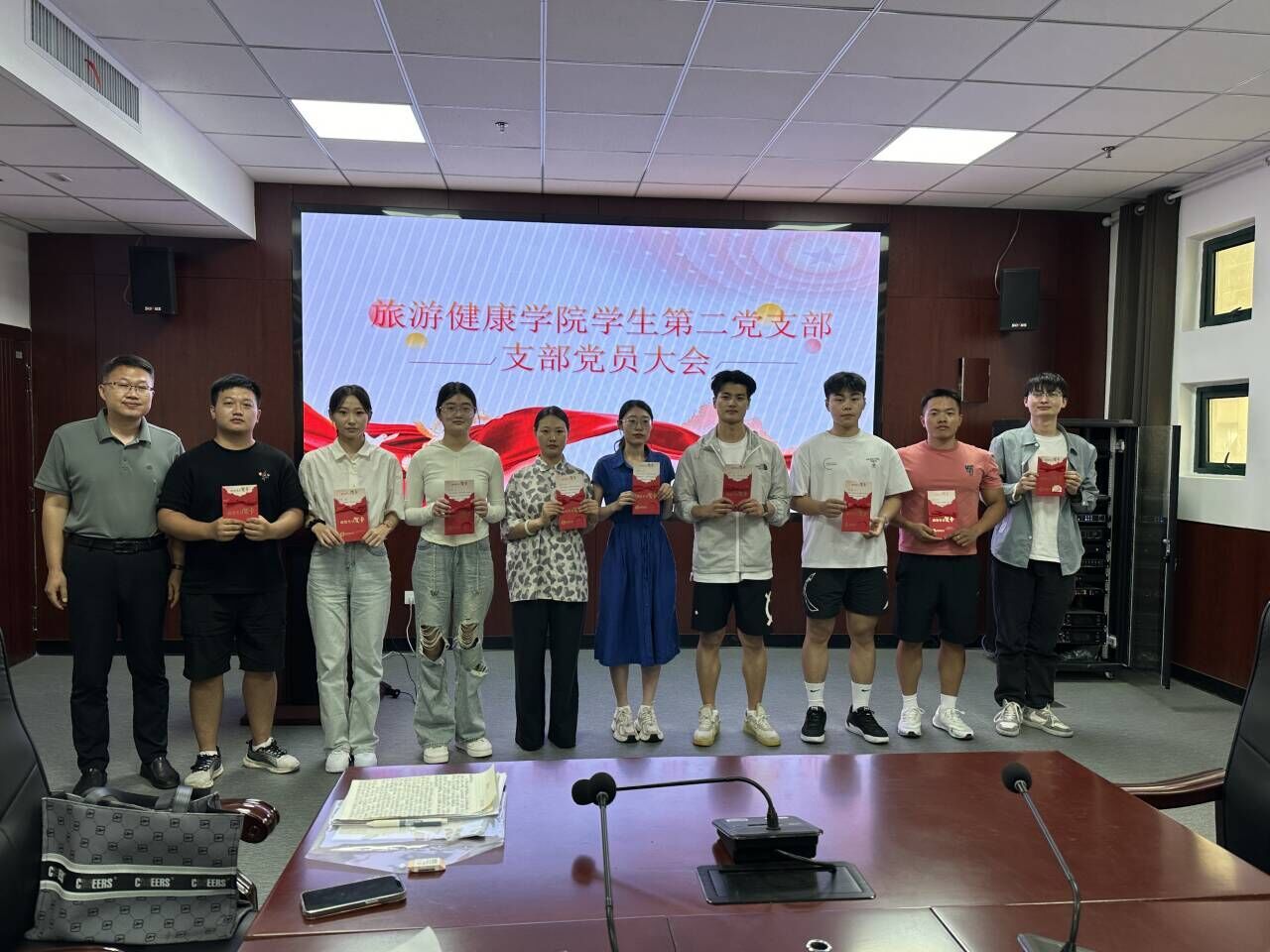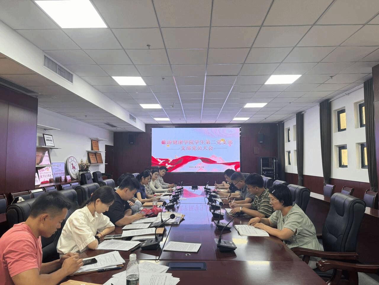 2024年7月4日,旅游健康学院学生第二党支部在学院会议室召开全体党员大会,讨论高宜碧等10名同学预备党员的转正事宜,会议由支部书记孙群主持,旅游健康学院党总支书记杨锐到会指导。