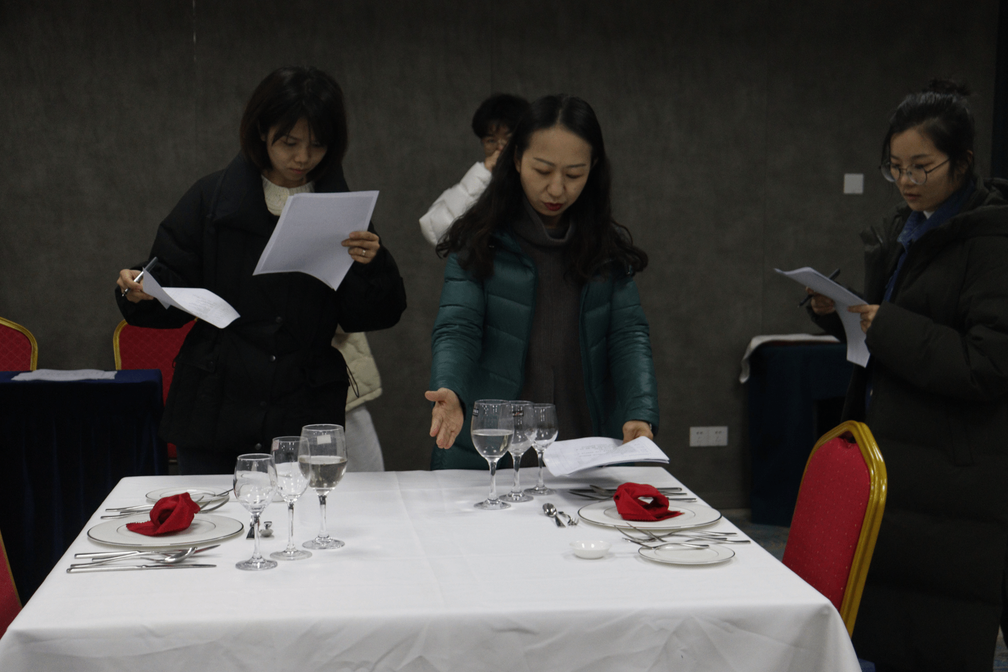 本次比赛采用团队赛形式,共计6组18名同学进入决赛,比赛环节分别是中餐服务、西餐服务与前厅接待服务。中餐服务比赛内容分别是仪容仪表、中餐摆台、即兴演讲;西餐服务比赛内容分别是西餐摆台、英语口语;前厅接待服务比赛内容分别是模拟酒店入住登记与退房结账服务。比赛中选手们展现出较高的专业技能和综合素质,最终周佩玲、顾欣宇和雷雨虹三位同学获得一等奖的优异成绩。(撰稿:李俊 审核:傅绪明)