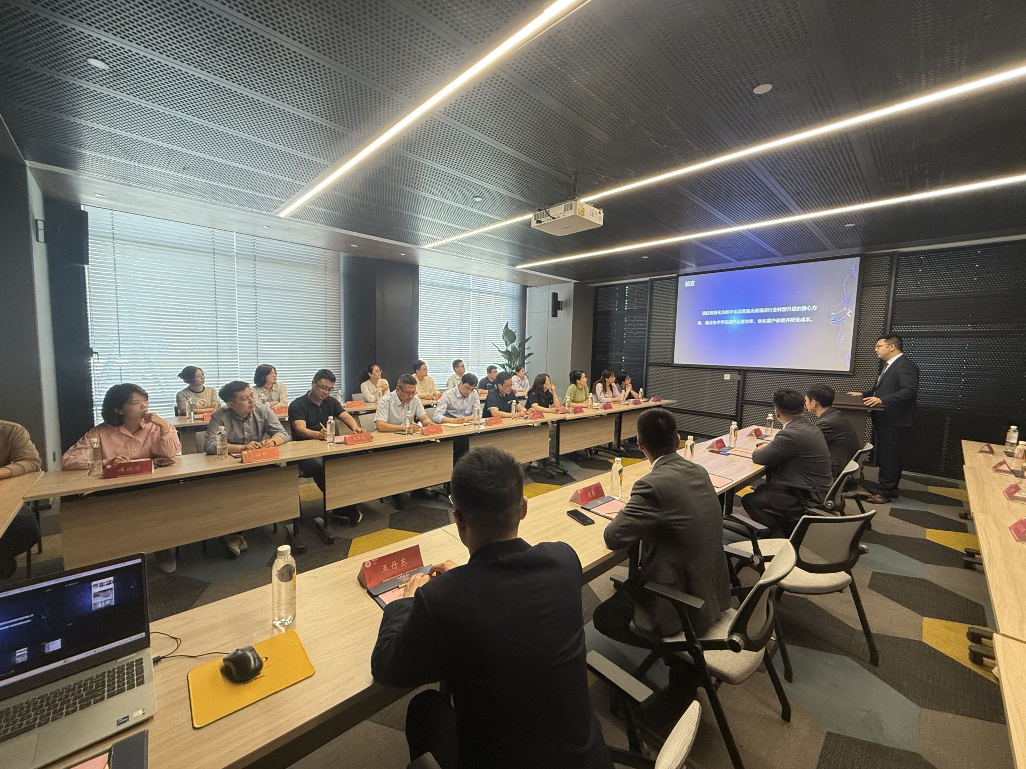 调研期间,VOCO酒店总经理李意介绍了数字化转型背景下酒店运营模式,分享了行业前沿动态。通过智能客房系统、AI服务机器人、云端管理系统等应用场景的解析,展现了“数据+”如何重塑传统酒店服务流程。前端构建客户画像实现精准服务,后端依托大数据分析优化运营决策,有效提升了酒店客需、智能客控和自动场景的服务效率和宾客体验满意度。
