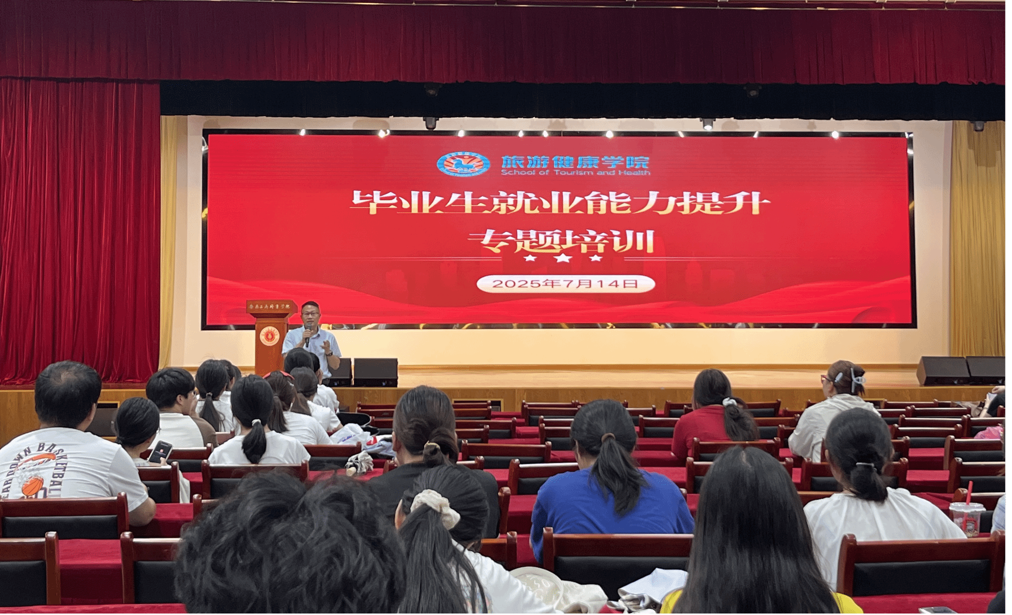 为切实做好2026届毕业生实习就业工作,深化产教融合,助力学生高质量就业,旅游健康学院于7月14日在大学生活动中心举办2026届毕业生企业宣讲会。本次活动吸引了合肥君悦大酒店、翡翠湖迎宾馆、苏州乐园森林世界、宁波南苑望海酒店、尚都酒店管理集团及中青旅等6家行业知名企业参与,为学院2026届毕业生搭建优质的实习就业对接平台。