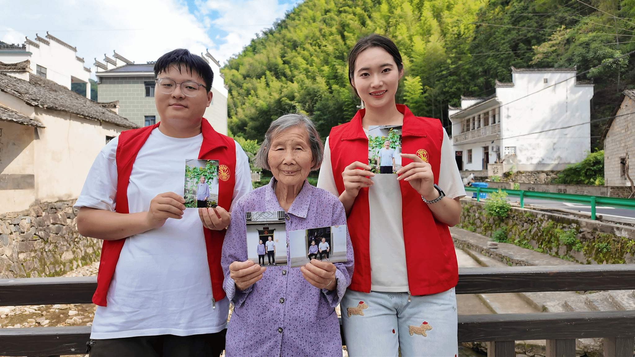 社会实践期间,团队还开展一系列丰富多彩的志愿服务活动。在村干部的带领下,团队深入山林腹地看望困难村民,并给他们送去了爱心物资,志愿者与他们聊起家常,热情地询问身体状况、生活情况。团队还专门开展了“给老人拍张照”志愿活动。快门按下,一张张饱经风霜的笑脸和一双双充满故事的双眼就此定格,同学们将打印好的照片送到老人手上,温情跃然纸上。