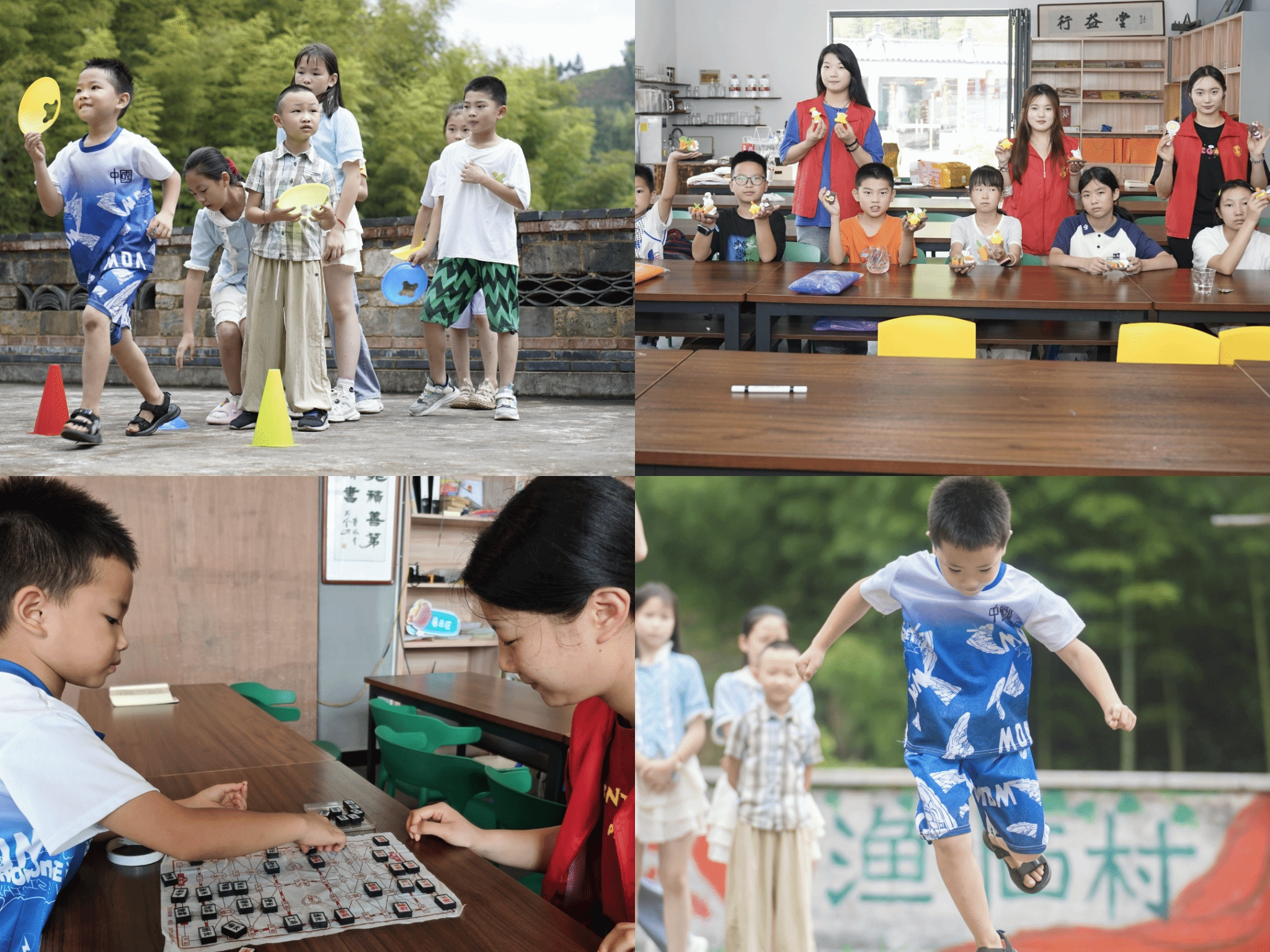 课业辅导环节,志愿者针对语文、数学等学科设计“趣味学习包”,将作业答疑转化为“知识大闯关”,增添学习的趣味性。绘画书法教学中,孩子们用画笔描绘,用毛笔书写,在色彩与线条间感受艺术之美。烹饪工艺与营养专业志愿者王浩婷依据专业学习中的非遗面塑技艺,指导孩子们通过一双双小手揉捏出“小兔子”“大熊猫”等作品,让非遗文化在孩子们指尖悄然传承。健身指导与管理专业志愿者孔可璐将少儿体适能训练带到了课堂上,巧妙设计了“绳梯跳跃”“平衡木挑战”“标志盘敏捷反应力训练”等游戏,帮助孩子们提升身体协调性。最令孩子们雀跃的是无人机演示环节,志愿者操作无人机拍摄村庄全景,讲解无人机和航拍知识,当看到自己设计的渔临村航拍路线图在屏幕上呈现时,孩子们眼中闪烁着对科技的向往。