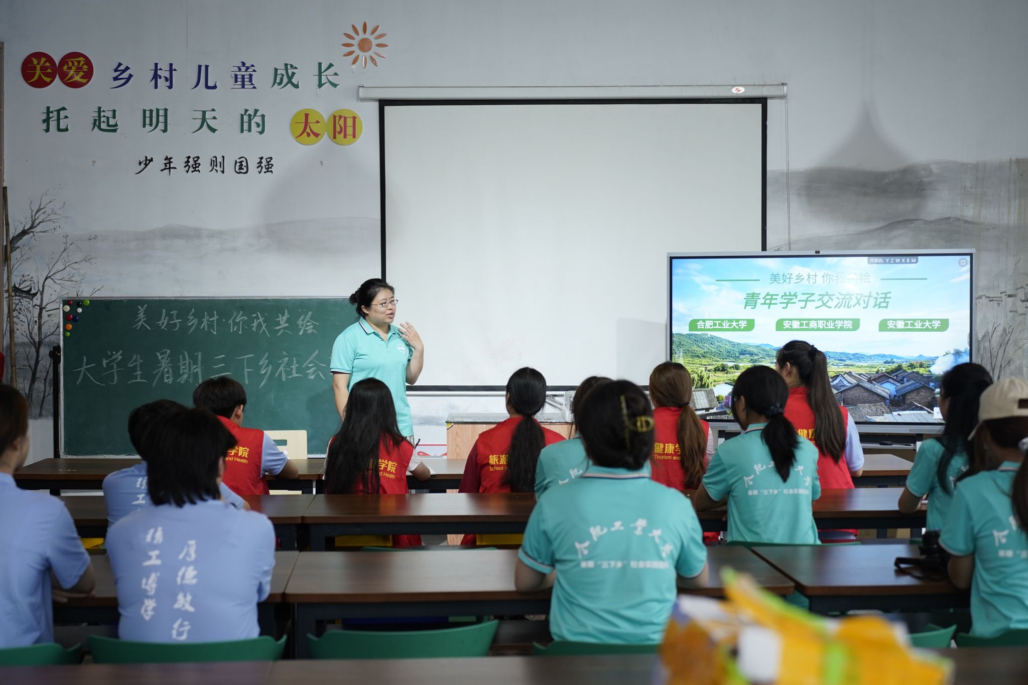 为深化实践育人成效,凝聚青年学子投身乡村振兴的智慧与力量,7月10日下午,安徽工商职业学院旅游健康学院暑期三下乡社会实践团队联合合肥工业大学、安徽工业大学社会实践团队,在黄山市休宁县源芳乡渔临村共同举办“青年学子成长交流对话”活动。三校指导教师及实践团队成员共30余人参与活动,大家围绕非遗保护、乡村教育、青春担当等主题展开深度对话,共绘乡村振兴青春画卷。