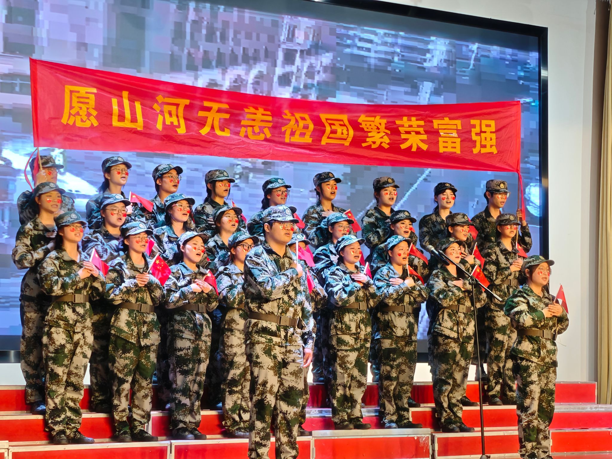 来自各班级的26支参赛队伍以饱满的热情、昂扬的姿态依次登台,用歌声演绎经典抗战曲目。《松花江上》《黄河大合唱》《保卫黄河》等作品气势恢宏,再现了中华儿女浴血奋战的壮丽史诗;《没有共产党就没有新中国》《歌唱祖国》《学习雷锋好榜样》《强军战歌》等曲目通过多声部合唱与创意编排,展现了在党的统一领导下,军民团结的智慧与力量;《如愿》《紫荆花盛开》《少年中国说》以深情旋律抒发新时代青年对先烈的缅怀,将现场气氛推向高潮。
