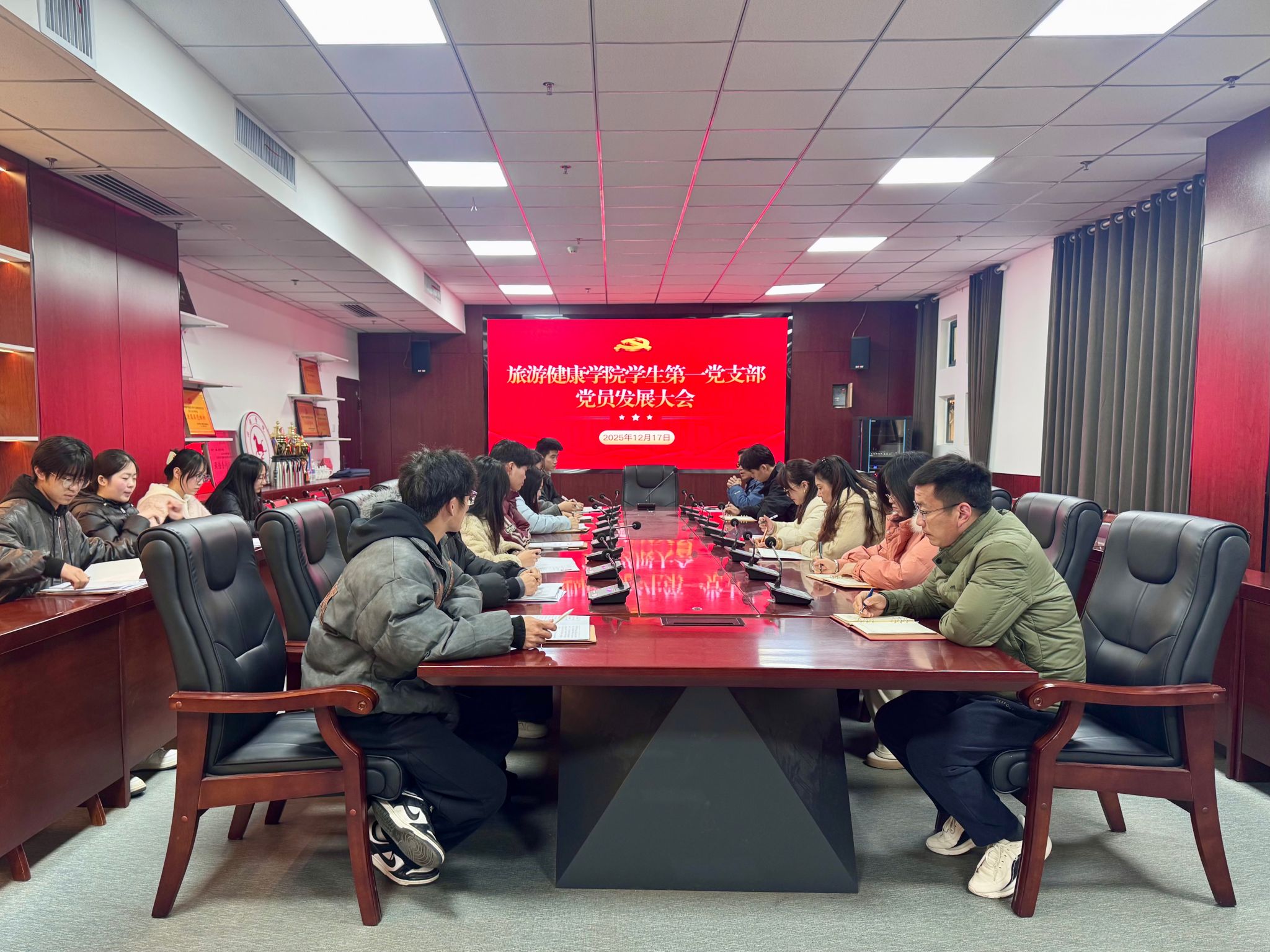 为扎实推进党员发展工作,为党组织注入新鲜血液,2025年12月17日,旅游健康学院学生第一党支部在学院会议室召开全体党员大会,专题讨论接收赵伟韬等11名同志为预备党员事宜。党支部书记张亚运主持会议,支部全体党员参会。