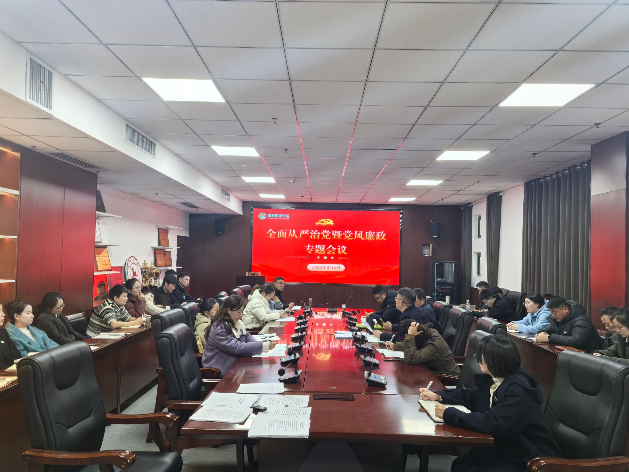 为深入推进全面从严治党,强化师德师风与纪律作风建设,筑牢校园廉洁防线,3月4日下午,旅游健康学院党总支召开新学期党风廉政建设专题会议。学院全体教师参加会议,会议由党总支书记杨锐主持。