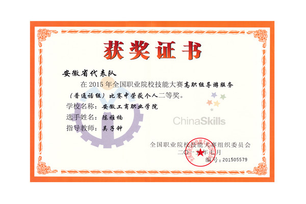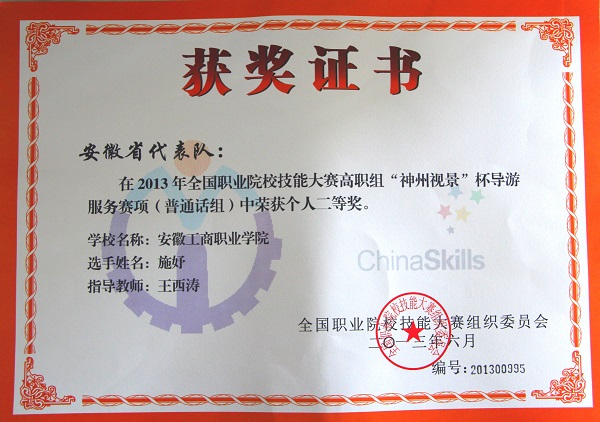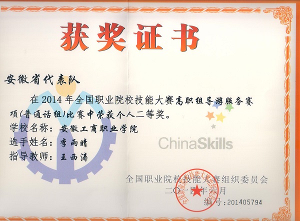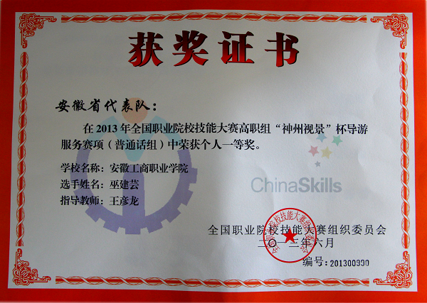 自2013年导游服务技能比赛纳入教育部主办的全国职业院校技能大赛以来,旅游管理专业学生连年获得安徽省职业院校技能大赛一等奖,每年都代表安徽省参加全国比赛,年年获奖,共获得国赛四个一等奖。2019年,一次获得两个国赛一等奖,创造了该赛项安徽省新的标杆。