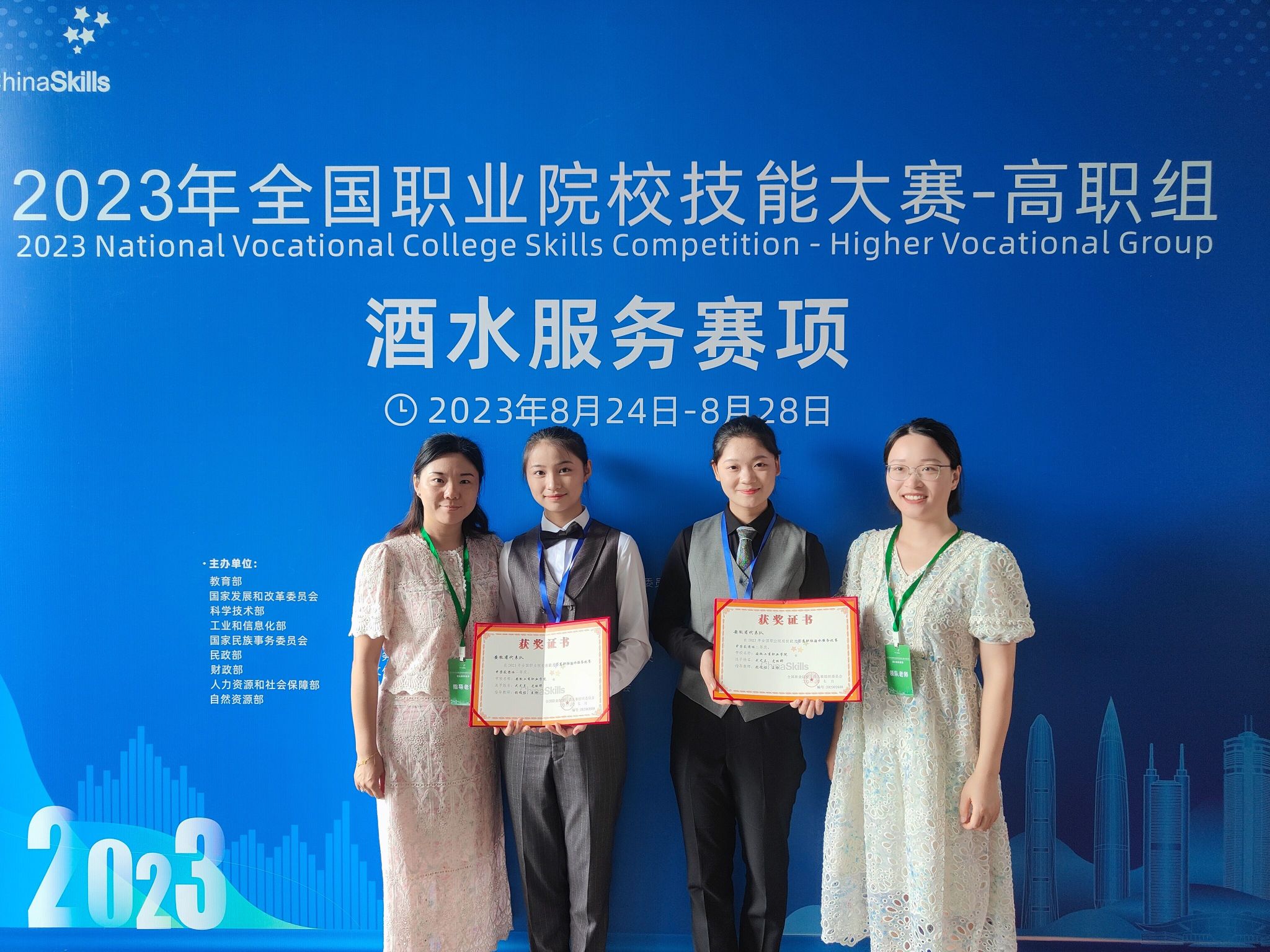 8月24日~8月28日,2023年全国职业院校技能大赛酒水服务赛项在深圳职业技术大学隆重举行,来自全国60所高职院校共120名选手参与角逐。在我校旅游健康学院张程程、王静、李俊等老师的悉心指导下,史丽娜、戎尤兰两位参赛选手经过五天的激烈竞争,最终荣获全国二等奖。