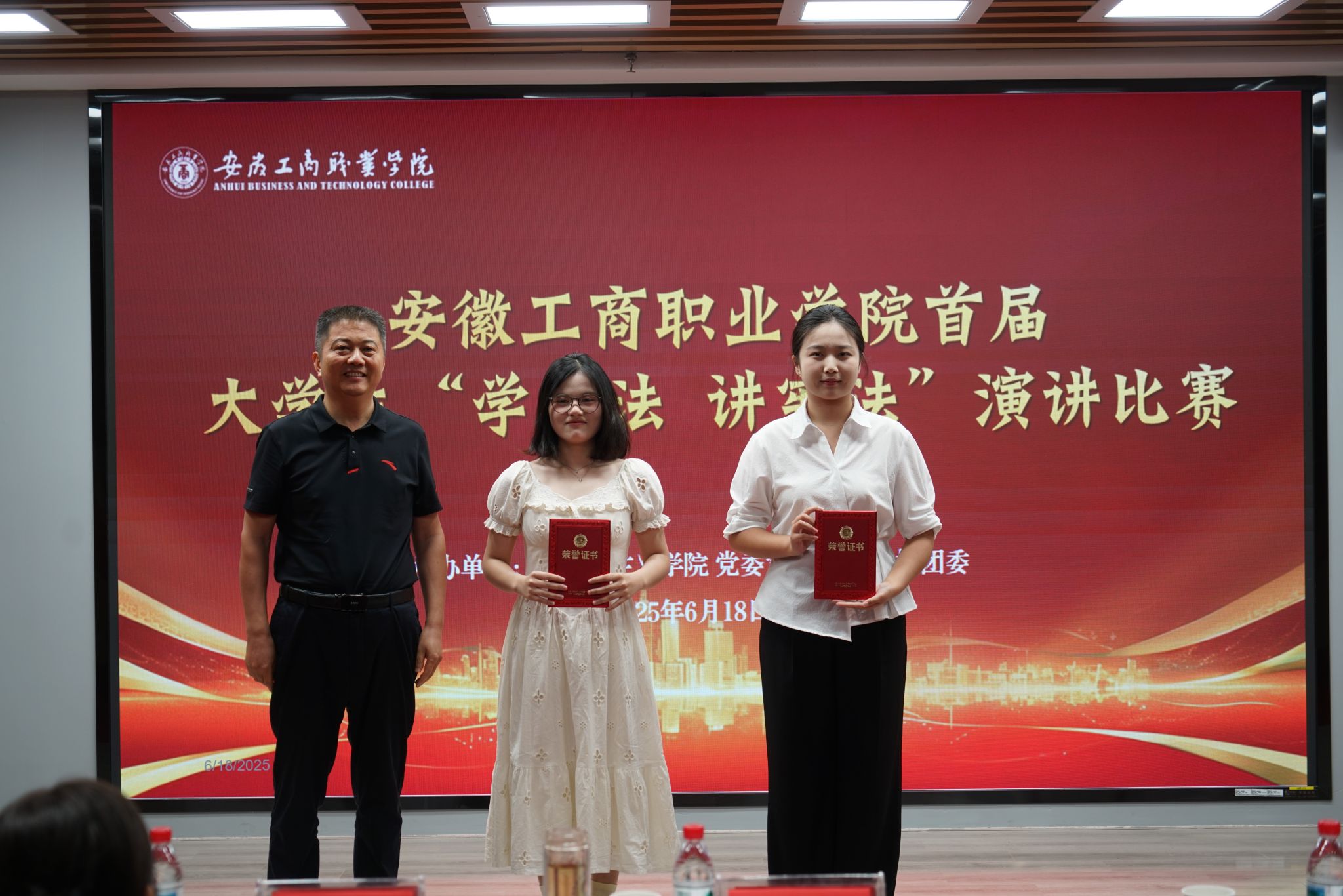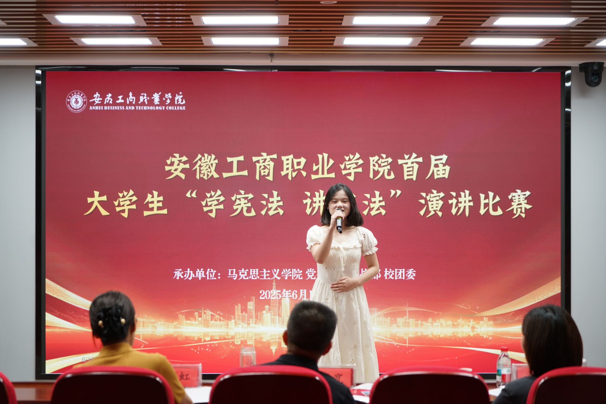 6月18日,安徽工商职业学院首届大学生“学宪法讲宪法”演讲决赛在综合楼智慧思政红色报告厅精彩上演。12名选手以“宪法之光映青春:做新时代法治中国的追光者”为主题,用青年视角诠释宪法精神,以时代语言传递法治温度,展现出青春与法治同频共振的担当。马院主要负责人、比赛指导老师、全体思政课教师及部分学生代表现场观赛。