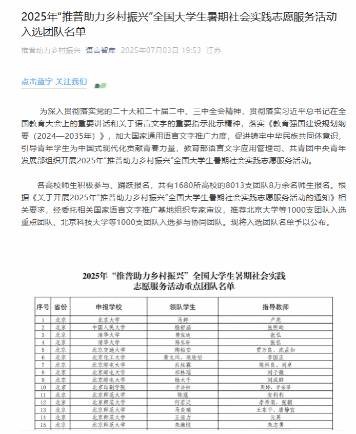 近日,由教育部语言文字应用管理司、共青团中央青年发展部组织开展的全国大学生暑期社会实践志愿服务活动项目评审结果揭晓,我校马克思主义学院师生入选2025年“推普助力乡村振兴”全国大学生暑期社会实践志愿服务活动重点团队(领队学生:王犇,指导教师:周丹萍、葛成飞),实现了我校志愿服务活动在全国项目上零的突破。