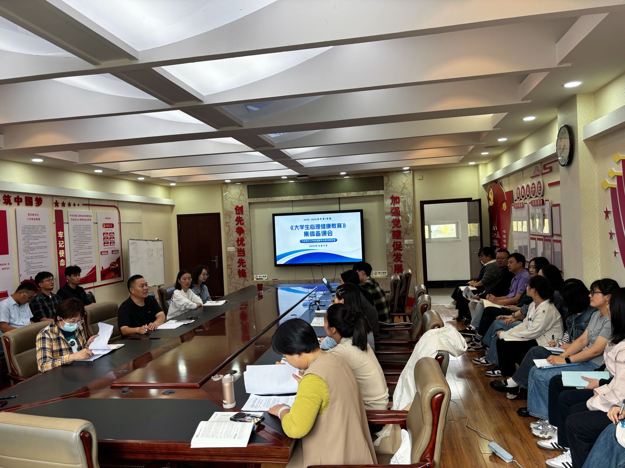 为进一步提升心理健康教育课程教学质量,构建全员育心格局,马院国家安全教育教研室召开2025-2026学年第一学期《大学生心理健康教育》集体备课会,马院副院长蒋强军、全体心理授课教师参加会议。会议围绕课程优化、教学创新等核心议题展开研讨,为新学期“心育”课程高质量开展打牢基础。