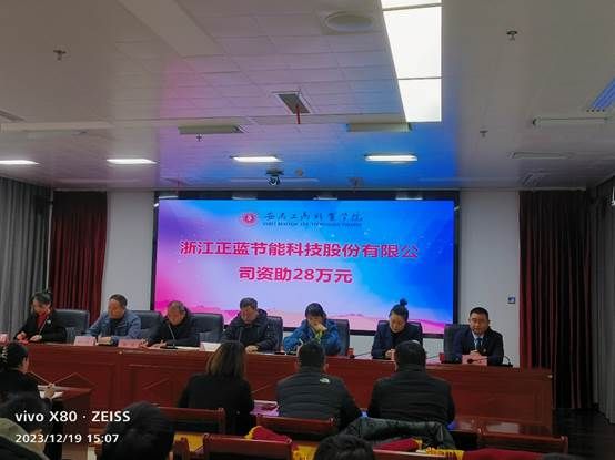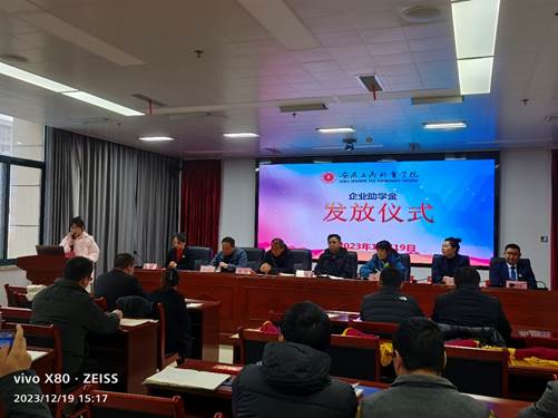 2023年12月19日下午, 安徽工商职业学院2023年度企业助学金发放仪式在双凤校区综合楼第二会议室顺利举行。院党委委员、副院长胡捍东出席,各二级学院党总支书记和资助专员,后勤管理处和学生处(学工部)主要领导及相关人员,浙江正蓝节能科技股份有限公司、合肥市天鲜配餐饮有限责任公司、武汉锦康餐饮管理有限公司、 安徽大佳一餐饮管理有限公司负责人及相关人员,受助学生代表等参加仪式。