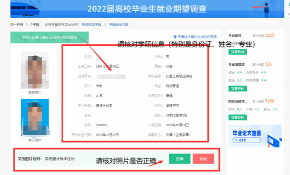 5.核对学籍信息和学历照片,若学历照片为本人,请点击“正确”,若学历照片非本人,请点击“有误”;在学历照片为本人的情况下,请勿随意点击“有误”;
