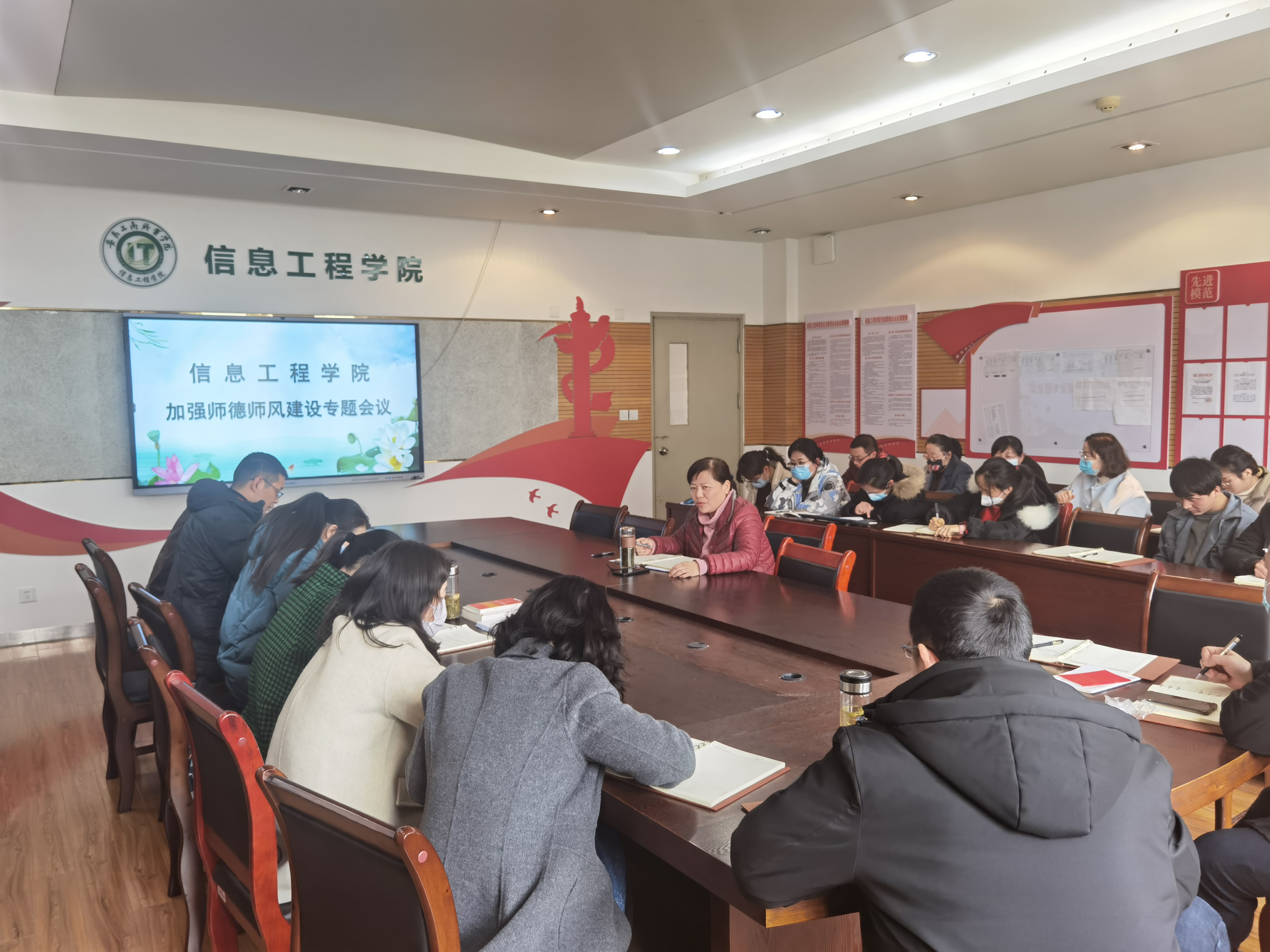 根据学校党委的统一部署,信息工程学院党总支于3月1日下午在党员活动室开展了新学期第一次全体教职工政治学习日活动暨加强师德师风建设专题会议,学院全体教职工参加了本次学习,活动由党总支书记张静雯主持。