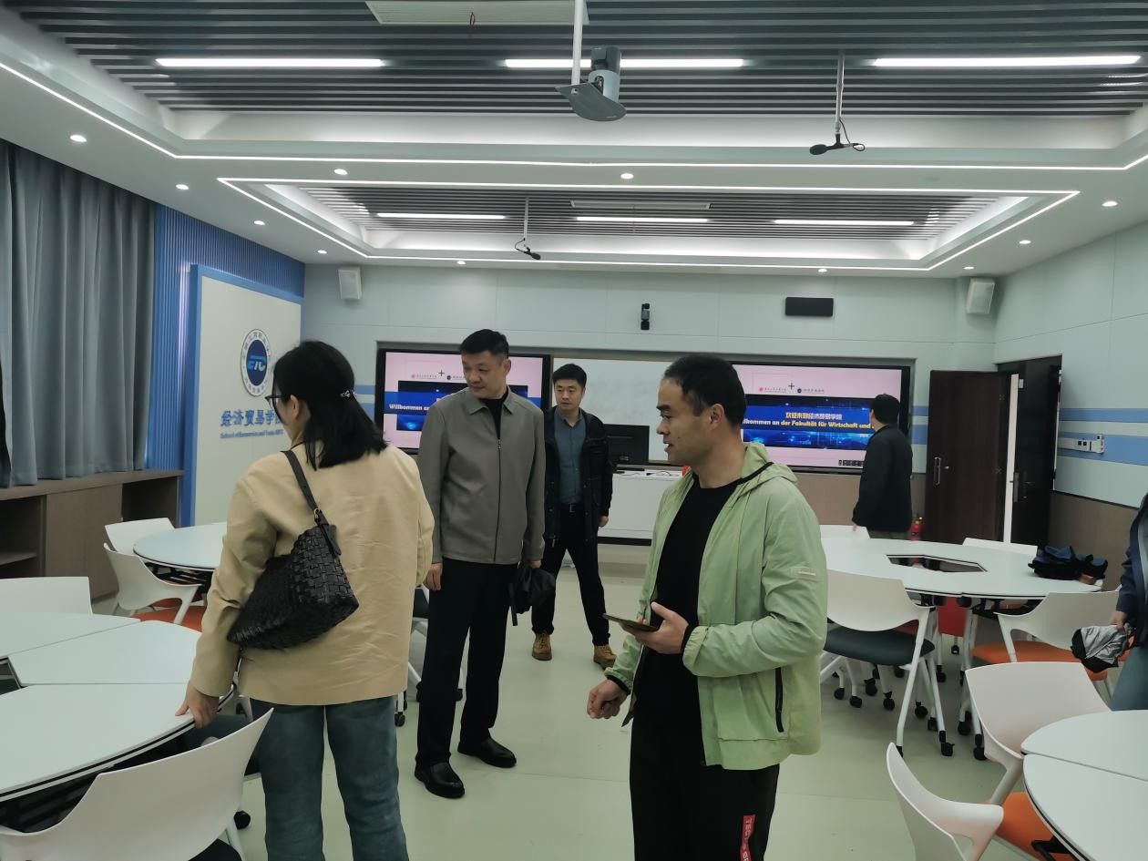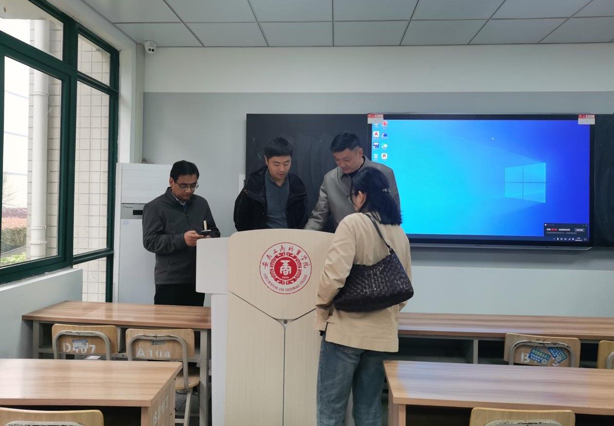 2026年4月23日上午,安徽广播影视职业技术学院教务处处长汪海,副处长陈士龙,管理学院副院长汪慧萍,马克思主义学院院长王莹,网络信息中心李兰俊一行5人莅临我校,专题调研智慧教室建设与应用情况。我校信息化建设与发展处处长余丙炎热情接待并陪同调研。