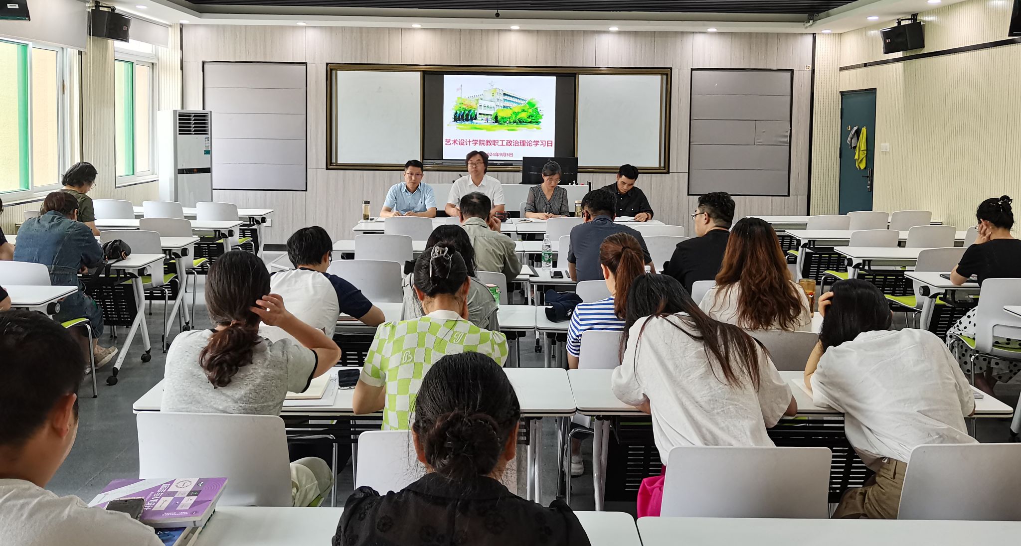 9月5日中午,艺术设计学院党总支在致知楼Z204智慧教室召开九月份教职工政治理论学习会。学习贯彻党的二十届三中全会精神;学习习近平总书记在中共中央政治局第十六次集体学习时的重要讲话精神;学习习近平总书记在中央全面深化改革委员会第六次会议上的讲话精神;学习贯彻学院党委书记齐建平在新学期全体教职工大会暨四届三次教代会、工代会上所作的《学院工作报告》。校党委委员、党委宣传统战部部长、艺术设计学院党总支书记孔成,艺术设计学院党总支副书记、院长魏芬,副书记张乐,副院长邱志斌及全体教职工参加学习。