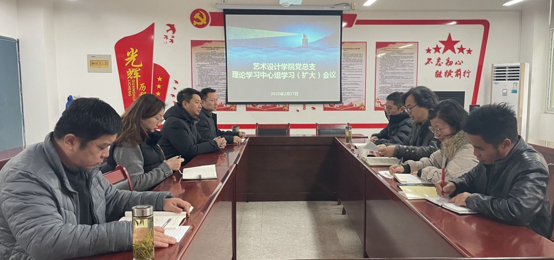 2月17日上午,艺术设计学院党总支在致知楼党员活动室召开2025年第一次理论学习中心组学习(扩大)会议。校党委委员、党委宣传统战部部长、艺术设计学院党总支书记孔成,艺术设计学院党总支副书记、院长魏芬,党总支副书记张乐,副院长邱志斌及学院党总支委员参加学习。