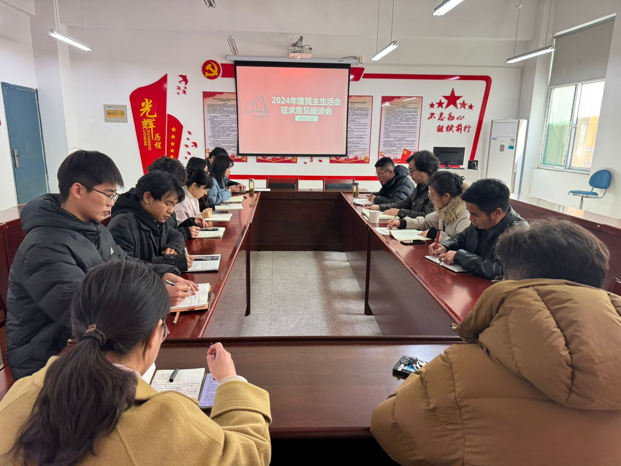 2月24日中午,艺术设计学院在致知楼三楼党员活动室召开2024年度民主生活会会前征求意见座谈会。校党委委员、党委宣传统战部部长、艺术设计学院党总支书记孔成,艺术设计学院党总支副书记、院长魏芬,党总支副书记张乐,副院长邱志斌参加会议。