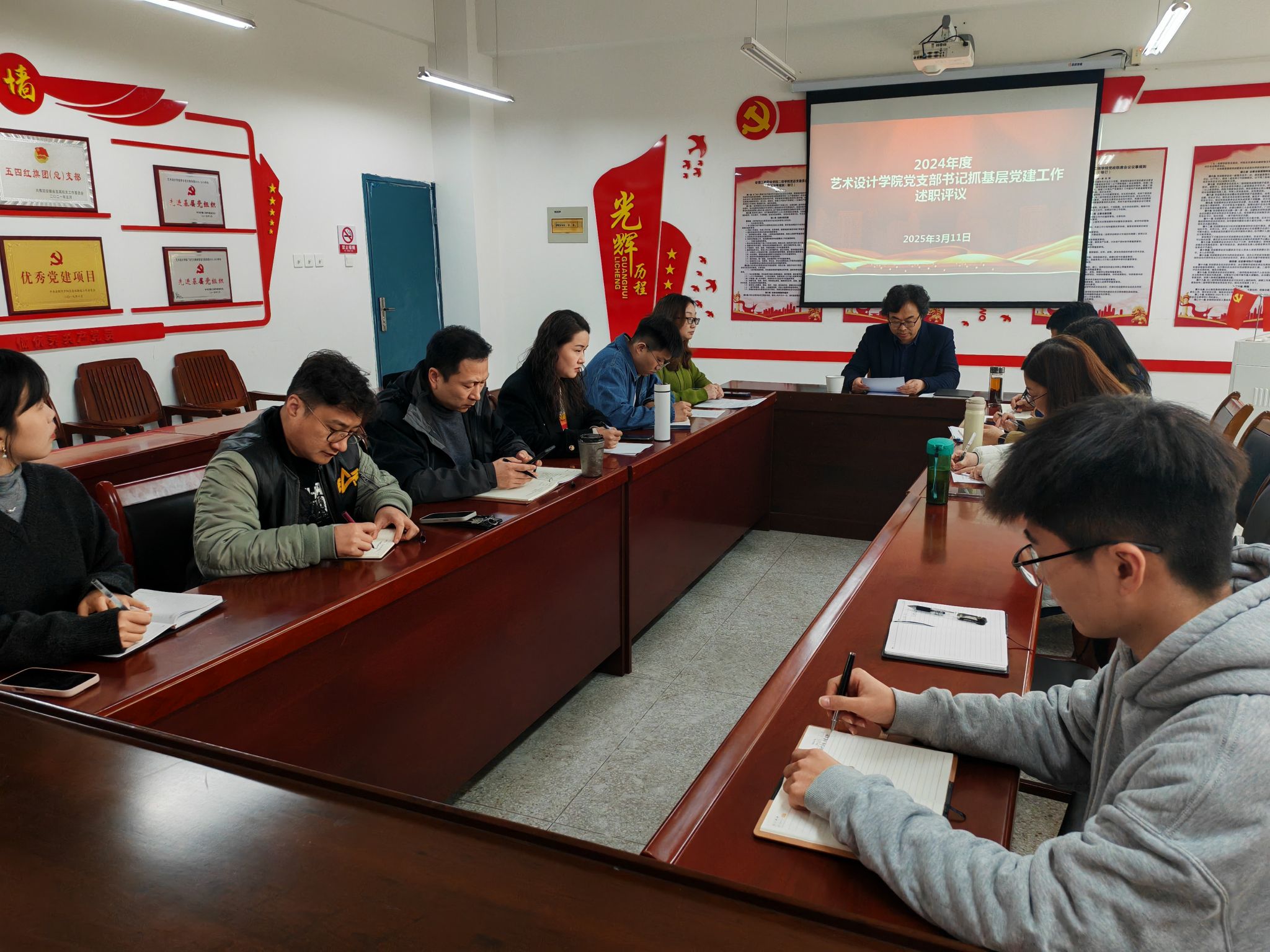 3月11日下午,艺术设计学院党总支在致知楼党员活动室召开2024年度基层党支部书记抓党建工作述职评议考核会议。党委委员、党委宣传统战部部长、艺术设计学院党总支书记孔成,艺术设计学院党总支副书记、院长魏芬,党总支委员,各支部书记,党代会、教代会代表,师生代表等参加会议。
