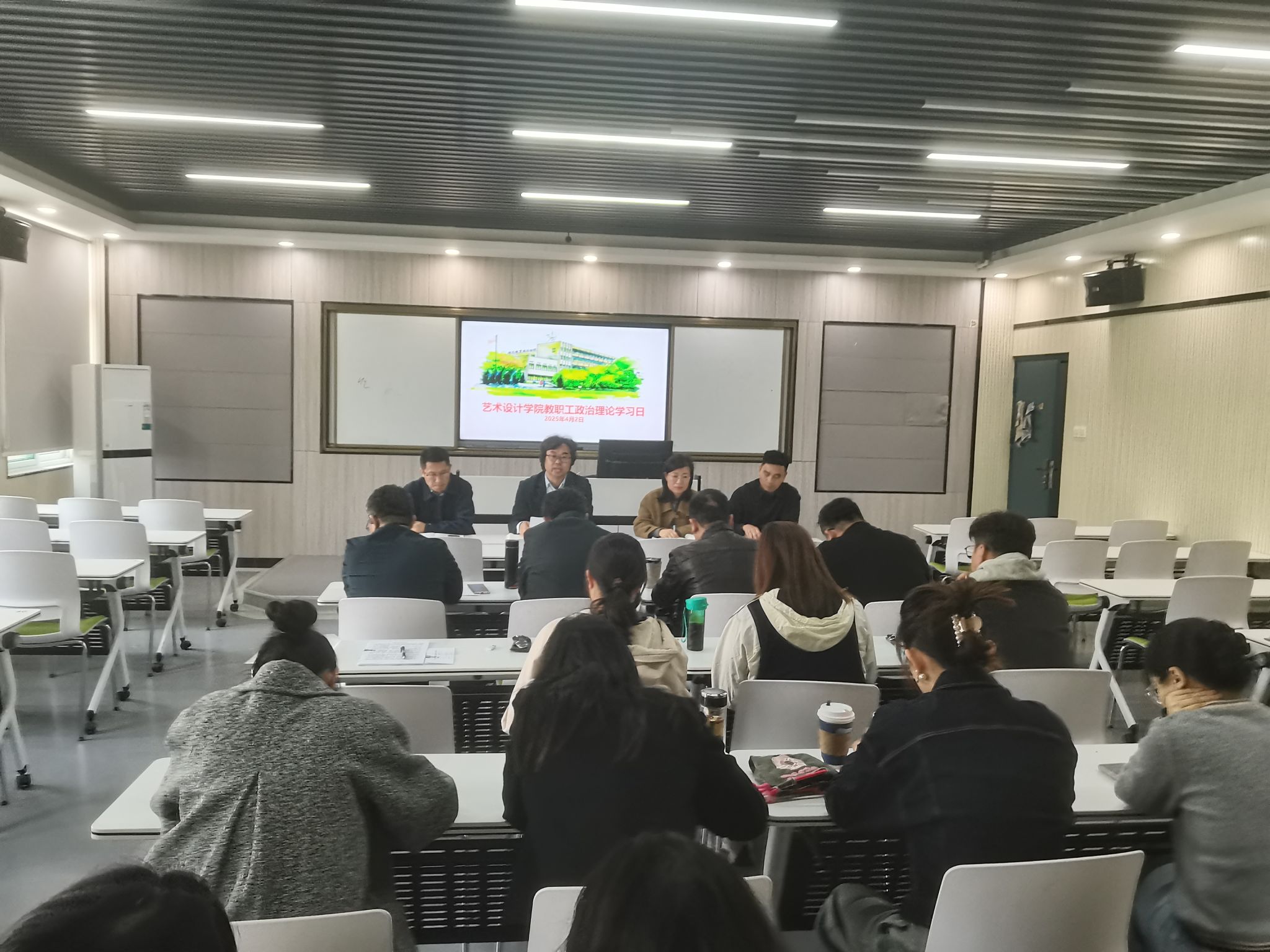4月2日中午,艺术设计学院党总支在致知楼204智慧教室召开四月份教职工政治理论学习会议,党委委员、党委宣传统战部部长、艺术设计学院党总支书记孔成,艺术设计学院党总支副书记、院长魏芬,副书记张乐,副院长邱志斌等全体教职工参加会议。