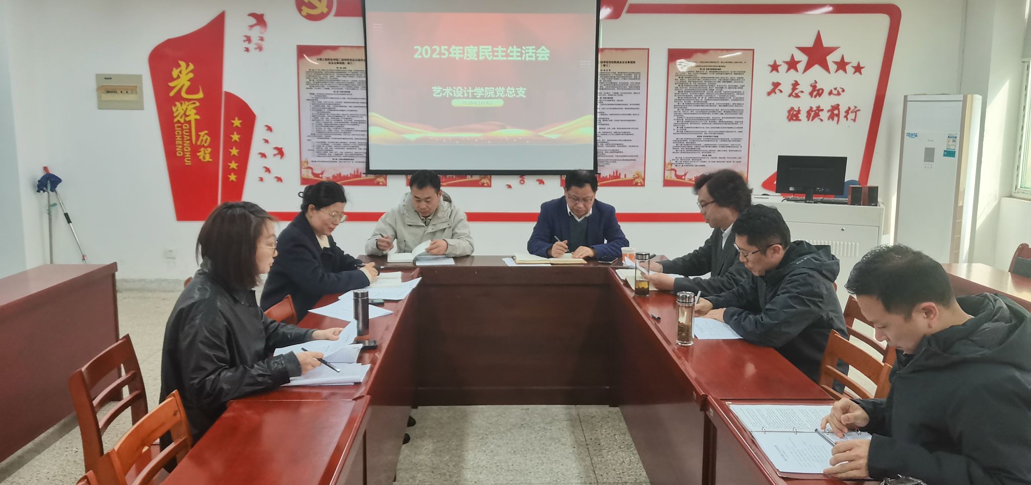 根据学校党委《关于召开2025年度民主生活会的通知》要求,3月9日下午,艺术设计学院在致知楼三楼党员活动室召开2025年度民主生活会。校党委委员、副校长胡捍东到会指导,校党委委员、党委宣传统战部部长、艺术设计学院党总支书记孔成,艺术设计学院党总支副书记、院长魏芬,党总支副书记张乐、党总支委员等参加会议。组织人事处杨高兴老师列席会议。